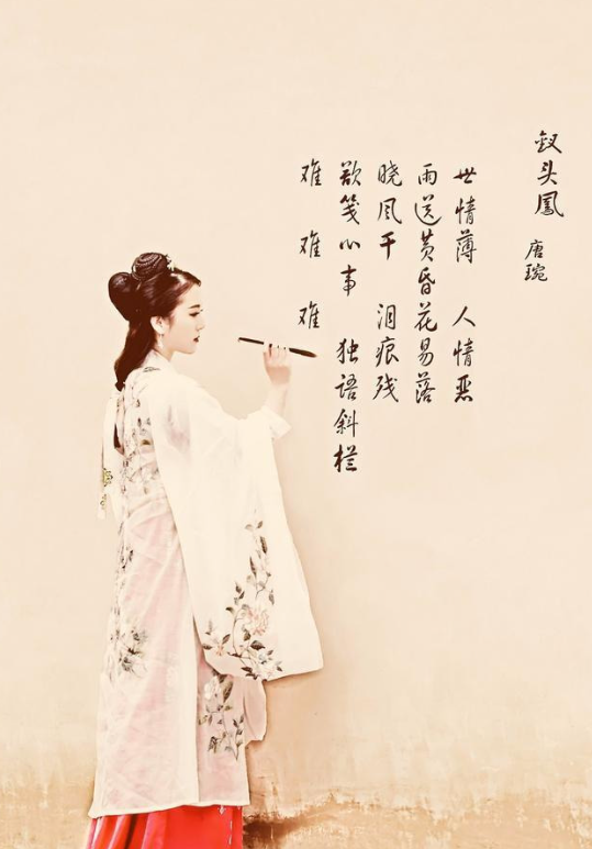 时光荏苒,陆游遵母命另娶王氏,唐婉也嫁给了不嫌弃她过往的赵士程。但两人心中对彼此的思念却从未淡去。一次偶然的游园会,两人重逢,四目相对,千言万语化作无声的泪水。此后,陆游挥毫泼墨,写下《钗头凤•红酥手》,字字泣血,句句含情;唐婉读罢,心如刀绞,亦以《钗头凤•世情薄》回应,不久后便香消玉殒,留下一段凄美的绝恋。