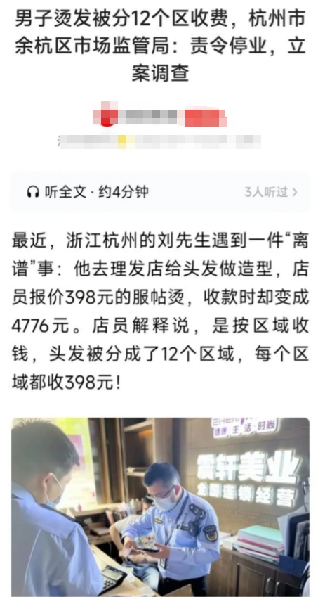 杭州理发店宰客是全网出了名的,“杭州不理发”也是网友的共识。杭州剪头发,他可以给你分十多个区域收费,剪完收你几千,甚至上万,现在“好”了些,降到4000。杭州各方面都很出色,唯独理发治不了,屡次发生宰客现象。前有永琪,震轩,永红…之类的店面,后继有来者,能宰一个算一个,反正客户报警也奈何不了,这明显就是黑社会敲诈勒索团伙的性质。