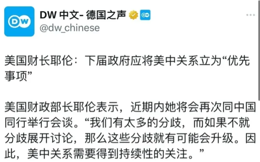 令人意外!耶伦表态了! 美国财长耶伦表示,下届美国政府一定要将中美关系列为优先事项。 有评论表示,耶伦这个说法,真的太让感到意外了。因为这是一不小心,把实话都说出来了。而耶伦担任财长这么长时间,也没有说过类似的话。那么她这次是怎么了呢? 有分析认为,耶伦临到任了,内心自然也多了几分淡然,终于能说一些实话了。而她这样的说法,显然让一些美国人非常不满,只是这也是事实。当前的中美两国,如果处理不好关系,对全世界都是不小的影响。