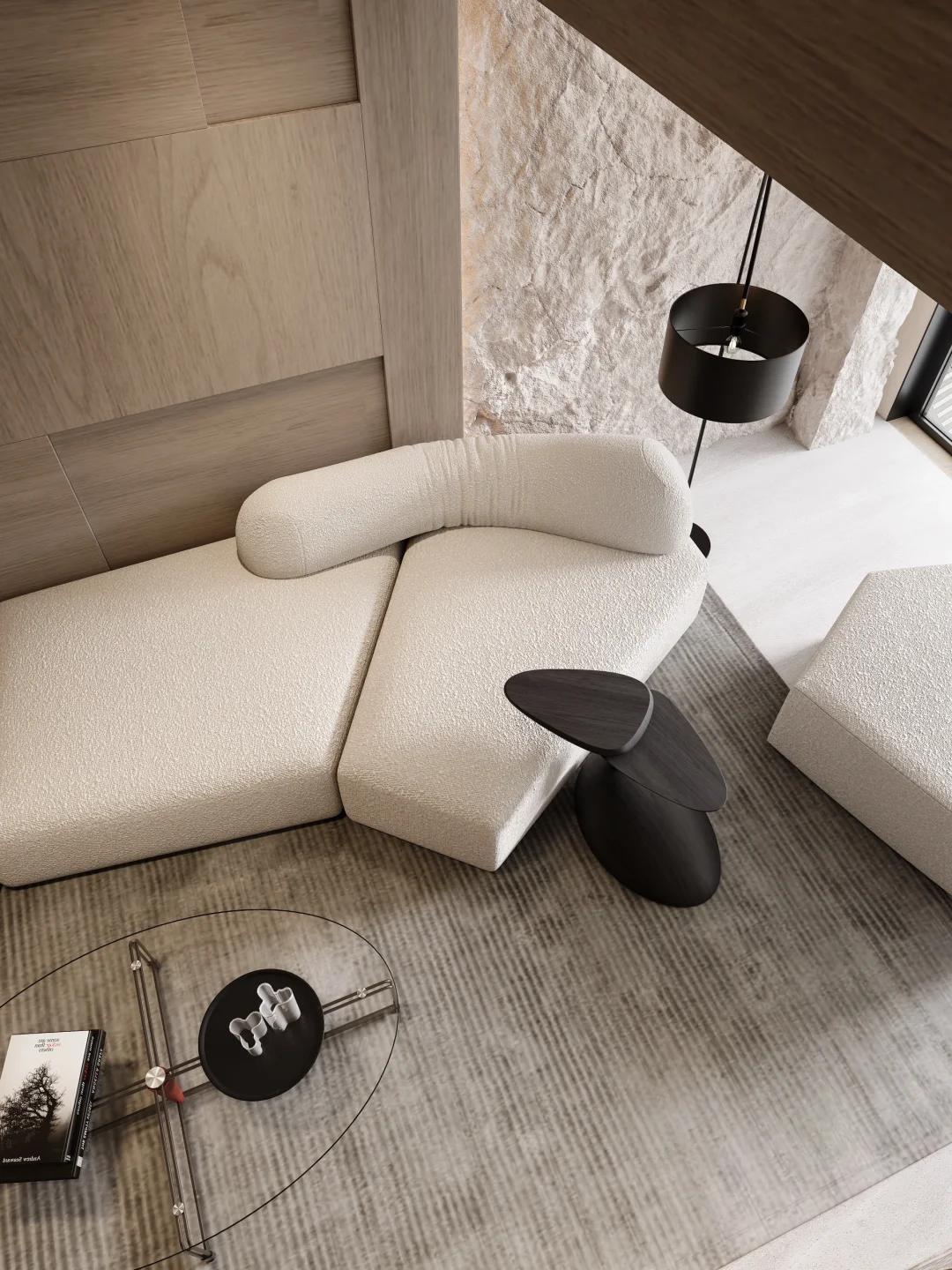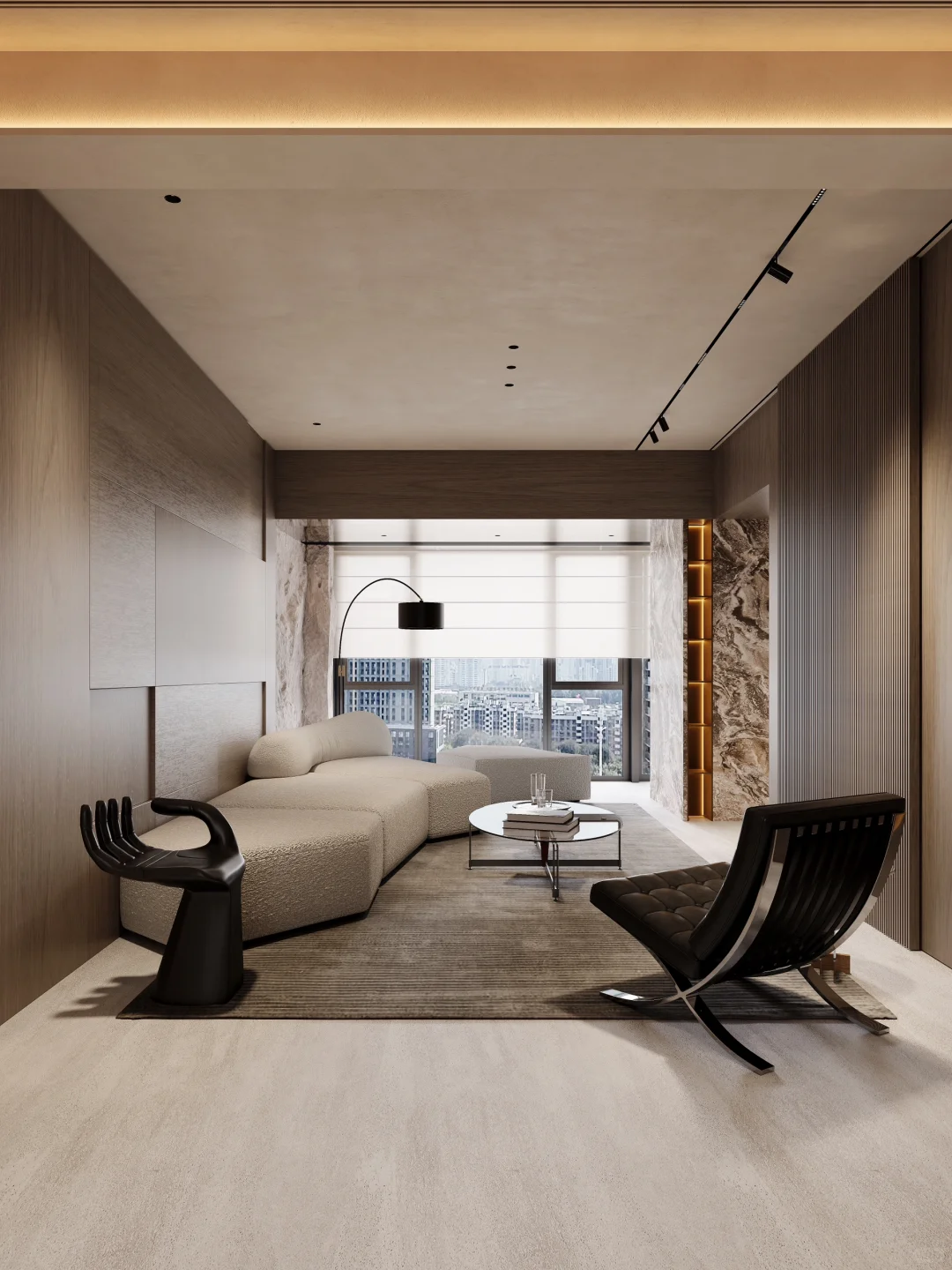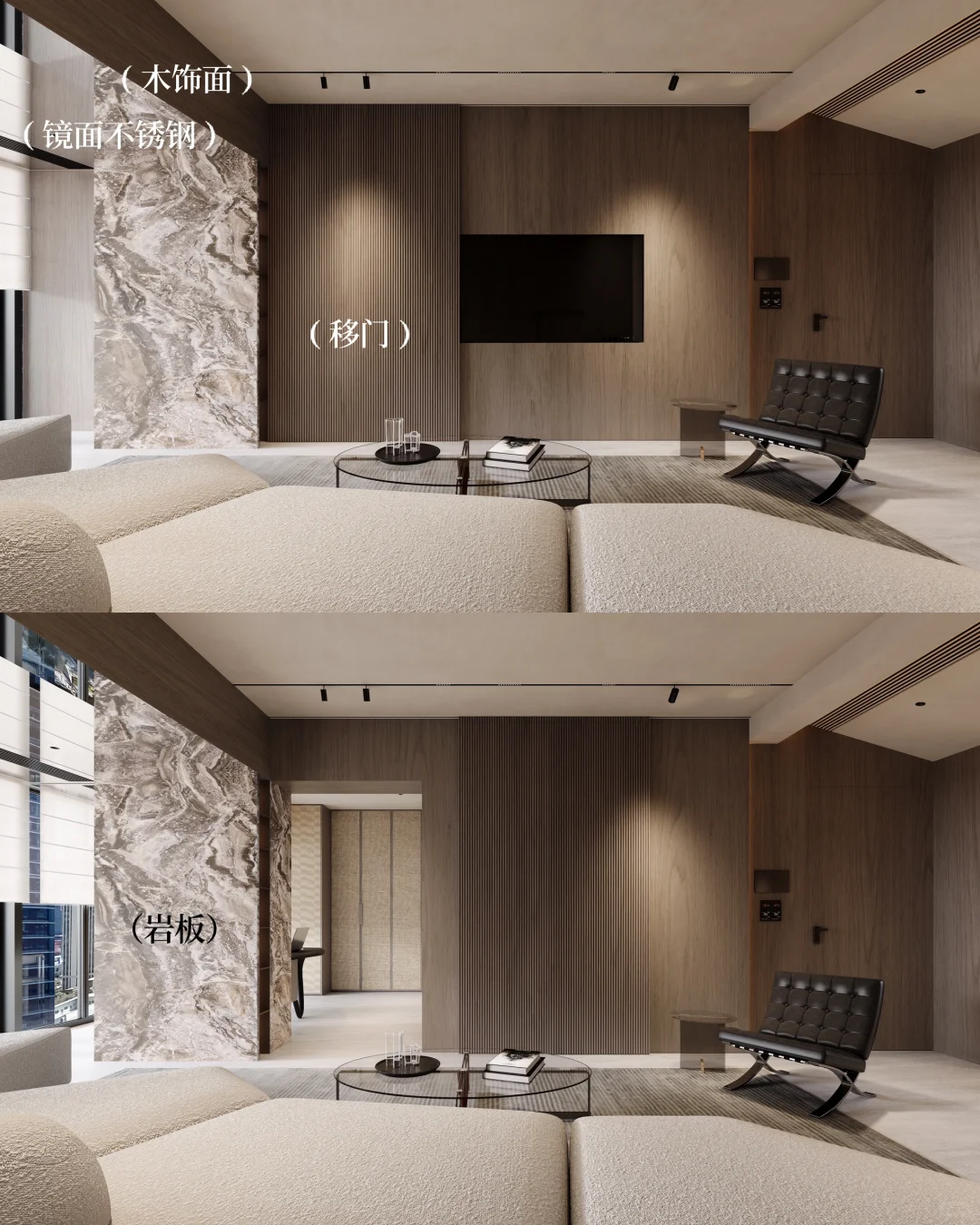 ADDRESS.温州滨江上品 本案中客厅是狭长而压层高的原始造型,为了居住使用不压抑,我们对客厅造型的材料选择上做了点改变:沙发背景是木艺造型柜与Pu石皮造型的结合,石皮靠近窗外,选用浅色在视觉上给空间延伸。石皮上方做整条镜面不锈钢,不锈钢材质反射石皮,视觉上拉长层高。正面视角则用墙面同色木饰面包边,与室内结合不突兀。不选用复杂吊顶,只选用简单造型的平顶搭配无主灯,完美改善住宅舒适度[派对R]