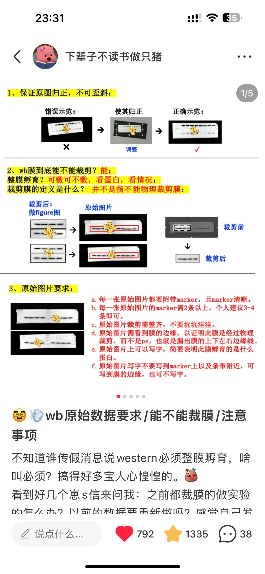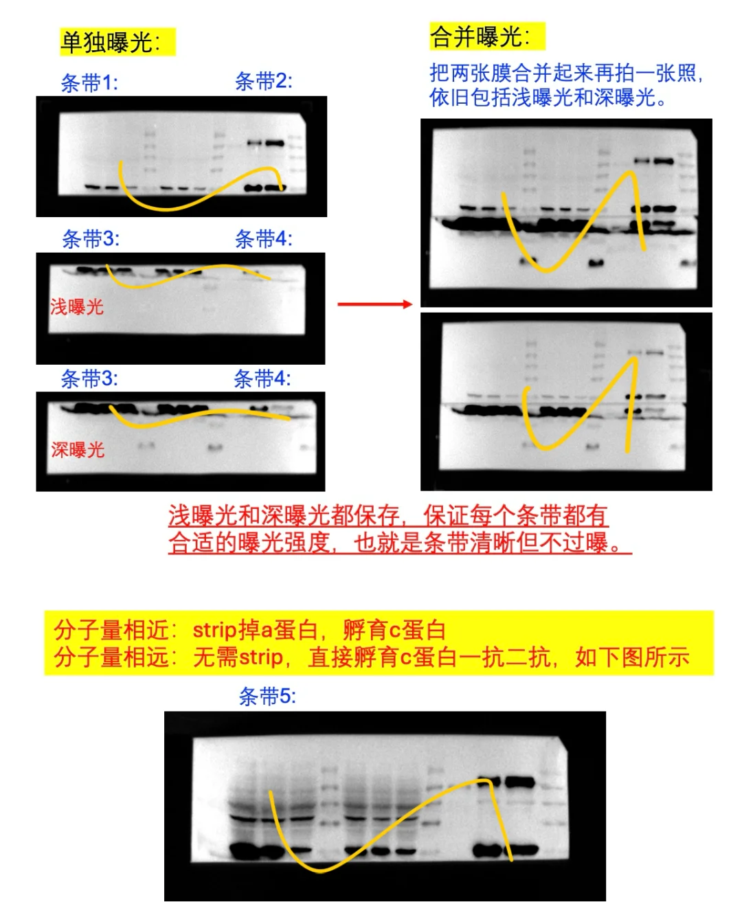 pvdf膜是可以裁剪的,关于wb原始数据的注意事项可以看图2图3的笔记,详细要点都分享过了,但有些宝还是不太放心裁剪,那就尝试一下图1的方法吧~[举手R] ✅一组数据可以放同一张膜跑,图解: 条带1是input A蛋白,条带2是ip A蛋白; 条带3是input B蛋白,条带4是与A互作的蛋白; 我把input和ip组放一起跑,因为孵育的同种蛋白。 ➡️因每个蛋白丰度,抗体效价等不同,深曝光浅曝光的图都要保存,每个条带都保证有合适的曝光度即可,曝光出的条带要清晰可见,但不过曝❗️ ✅分别曝光后把裁剪开的膜手动合并为一张膜,再进行曝光,依旧深曝光浅曝光都保存~ ✅input如果还要孵育别的蛋白,看条带5的示例。 分子量相近,strip后再孵育别的蛋白; 分子量想远,无需strip,直接孵育一二抗即可。 ✅孵育多条带原则: 先孵目的,再孵内参; 先孵效价低的不太好孵育蛋白,再敷容易的。 如果先敷容易的,再strip,不好敷的例如磷酸化蛋白很可能就直接敷不出来了。