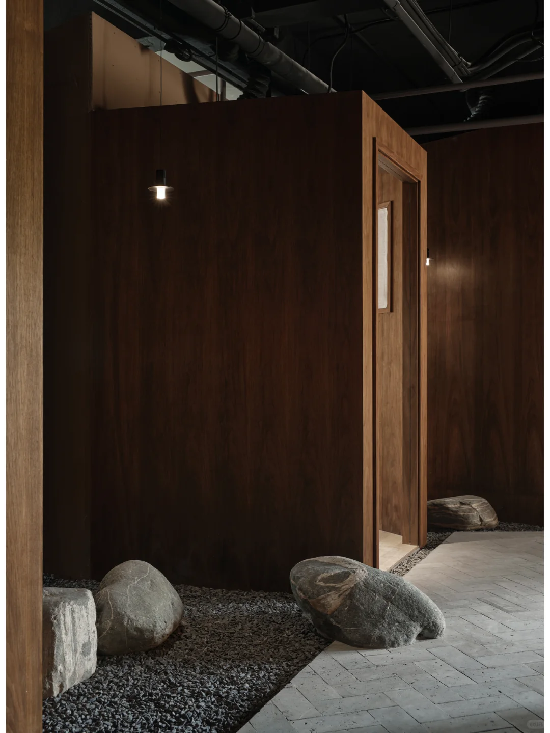 采取这样的形式语言,一方面是避让空间中的柱与梁以尽量减少结构横穿造成对小空间氛围的打扰,同时形成与坐立不同身体姿态相对应的高低错落的空间体验;另一方面也尝试拟态一种自然造物所独有的景观属性。