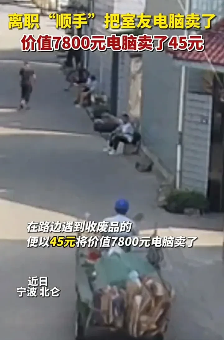 近日,浙江宁波一名男子辞职准备回家,走之前却偷走室友价值7800元的电脑,并以45元的价格卖给收废品的大爷。室友发现电脑丢失迅速报警,通过监控得知是男子所为,目前该男子已被警方抓获。
