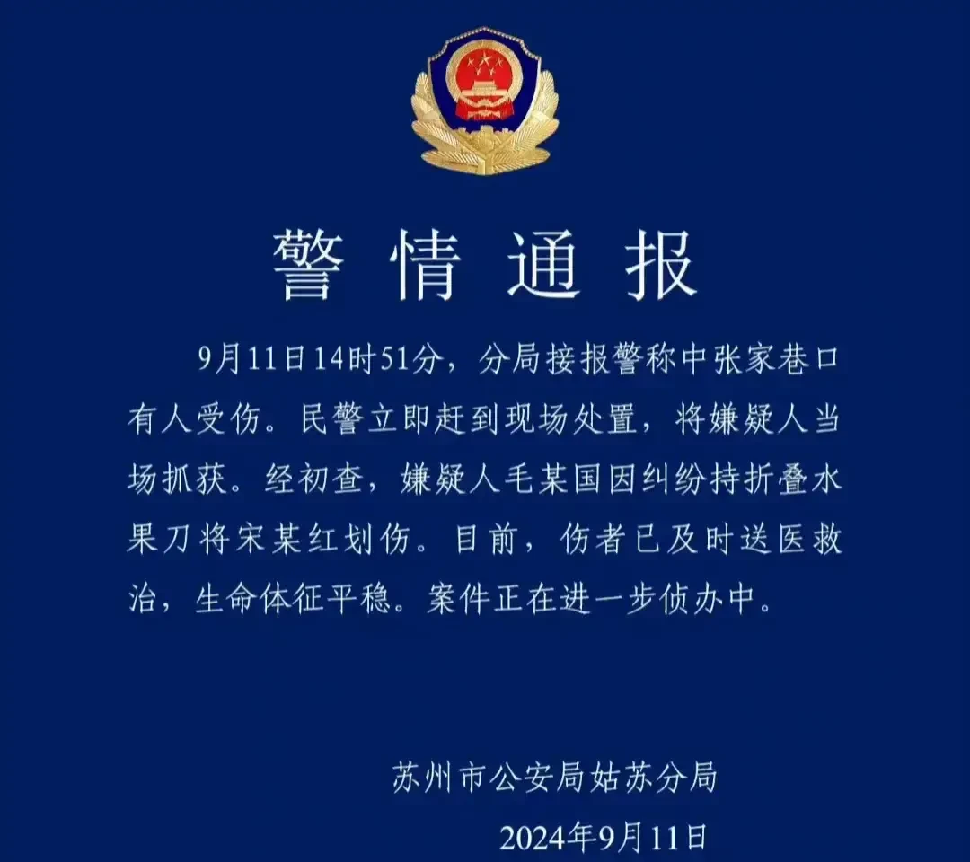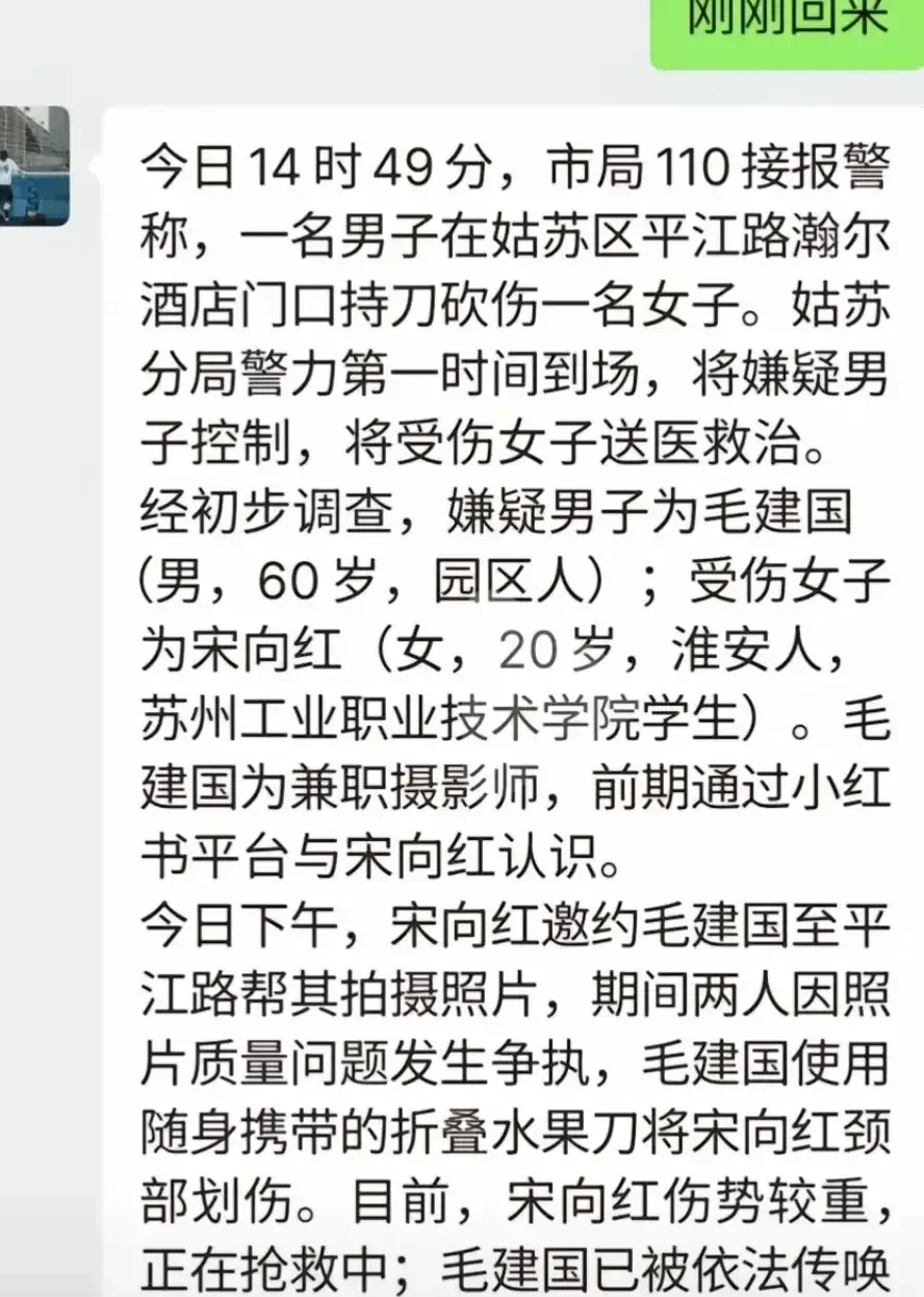60岁的兼职摄影师毛建国,手持折叠水果刀捅向了20岁的苏州工业职业技术学院的宋向红学生!