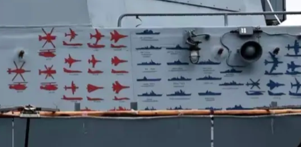在舰艇上层建筑绘制舰机轮廓识别指南,是俄海军的一项老传统,几乎所有水面舰都有这样的识别图。己方舰机标志为红色,外方标志为蓝色。