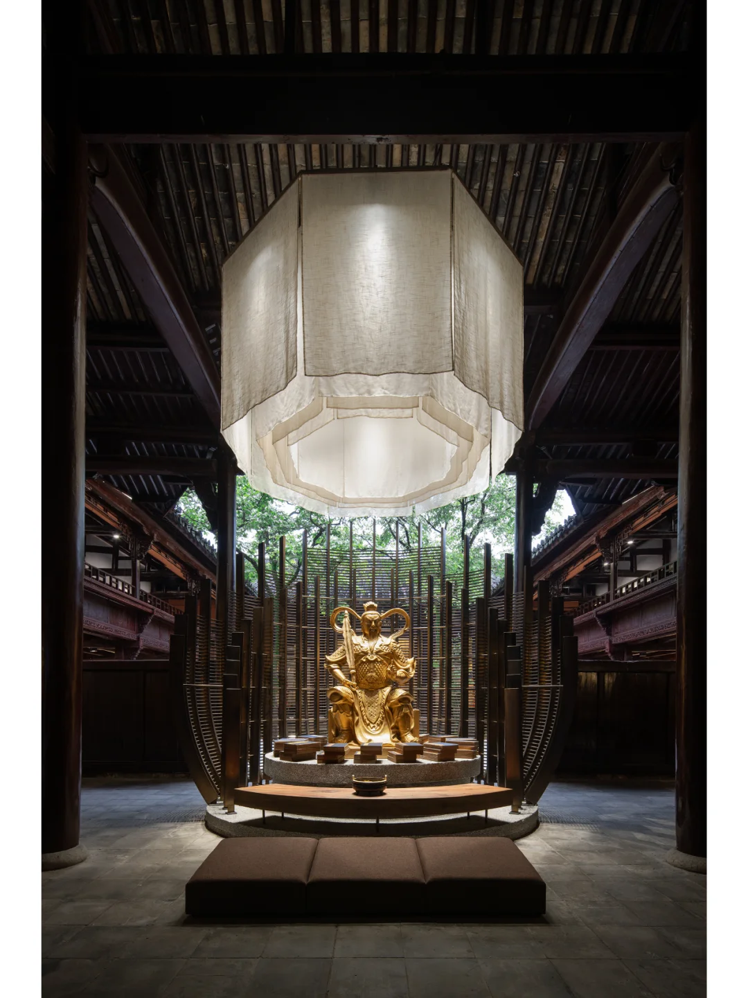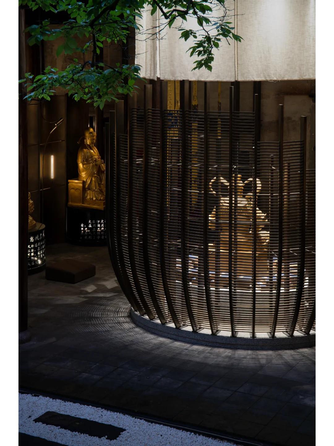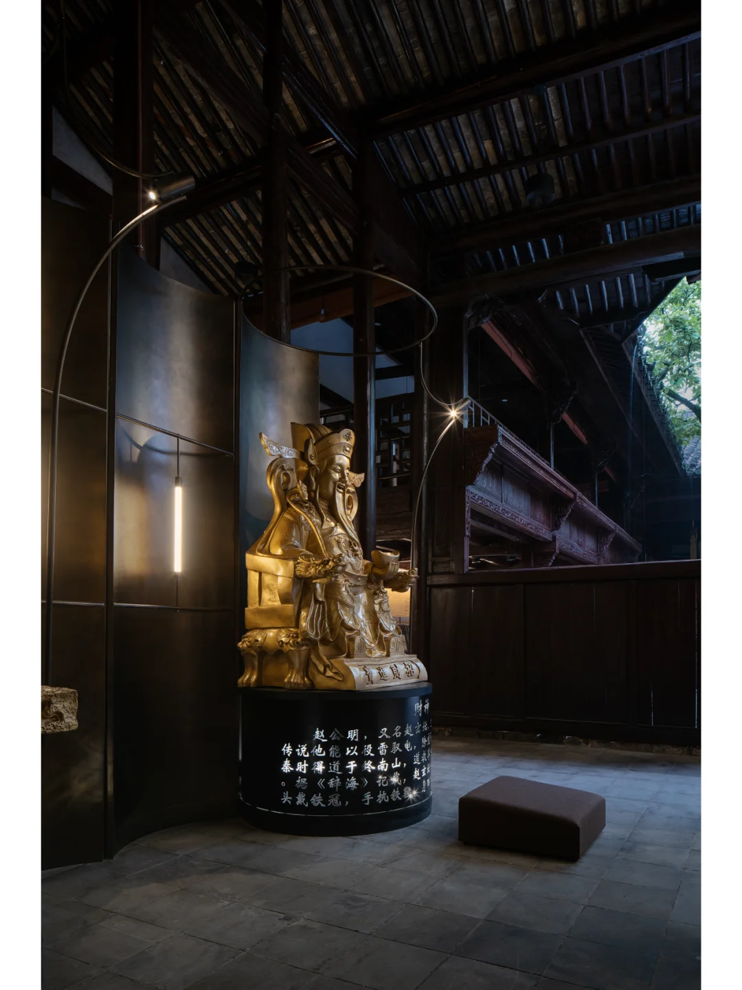 在不增加任何固定墙体、装置的前提下,整个空间以可移动组装物件及模块化组合的方式进行重构与植入,将神像底座、展示架、软饰与灯光的结合作为设计重心,以便在施工过程中达到快速、可实施且廉价、有效的设计目的。