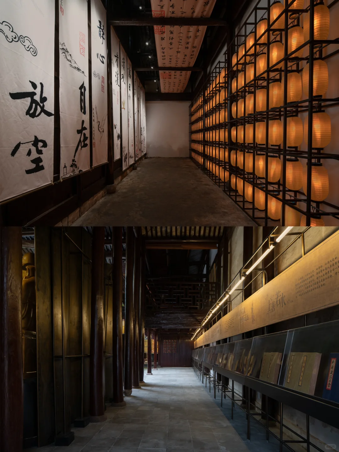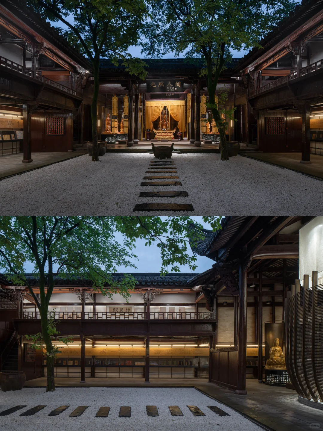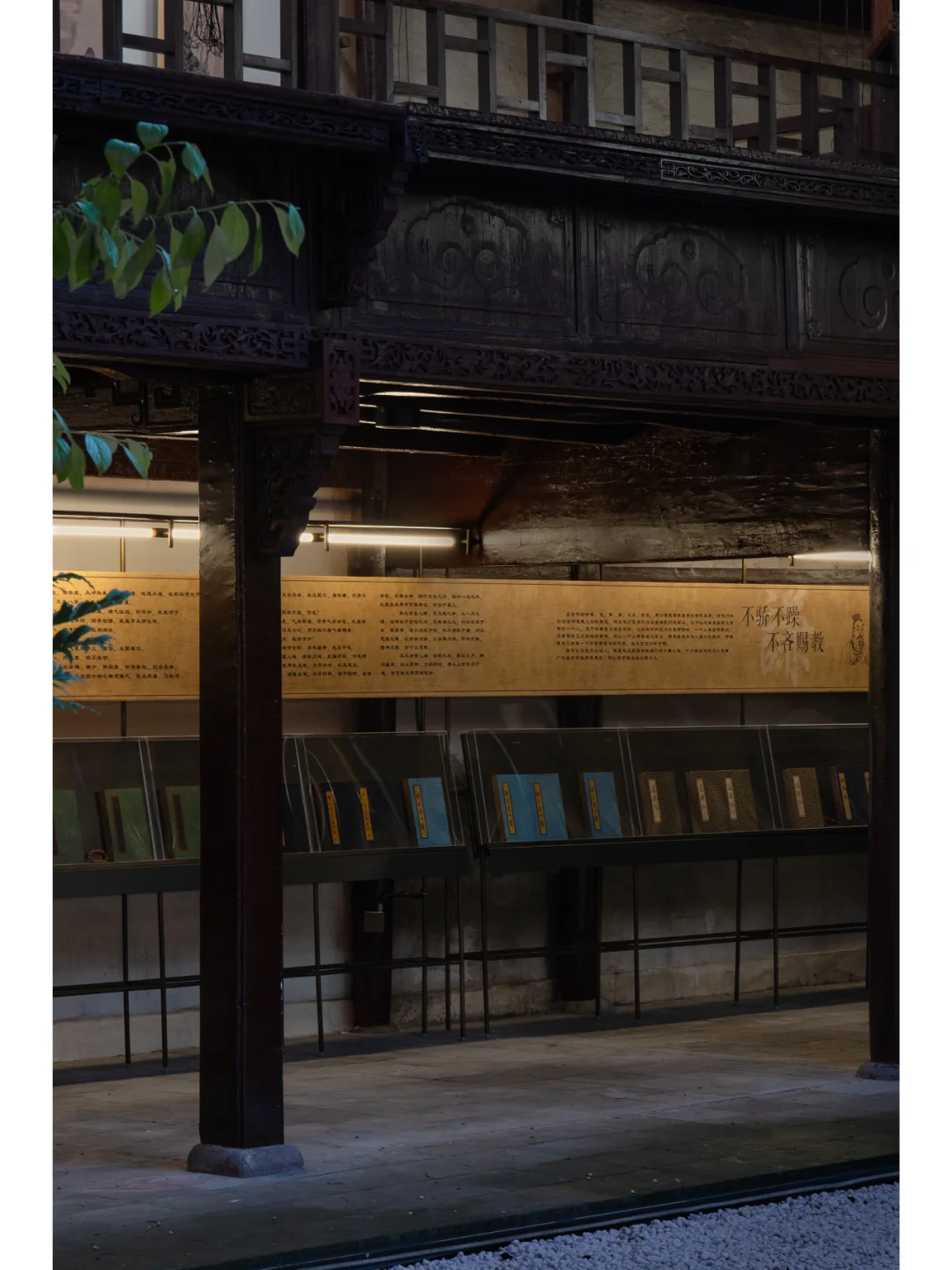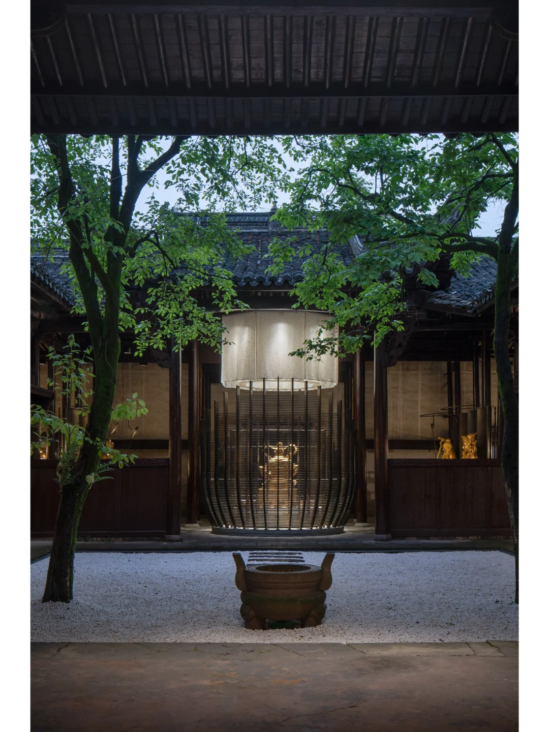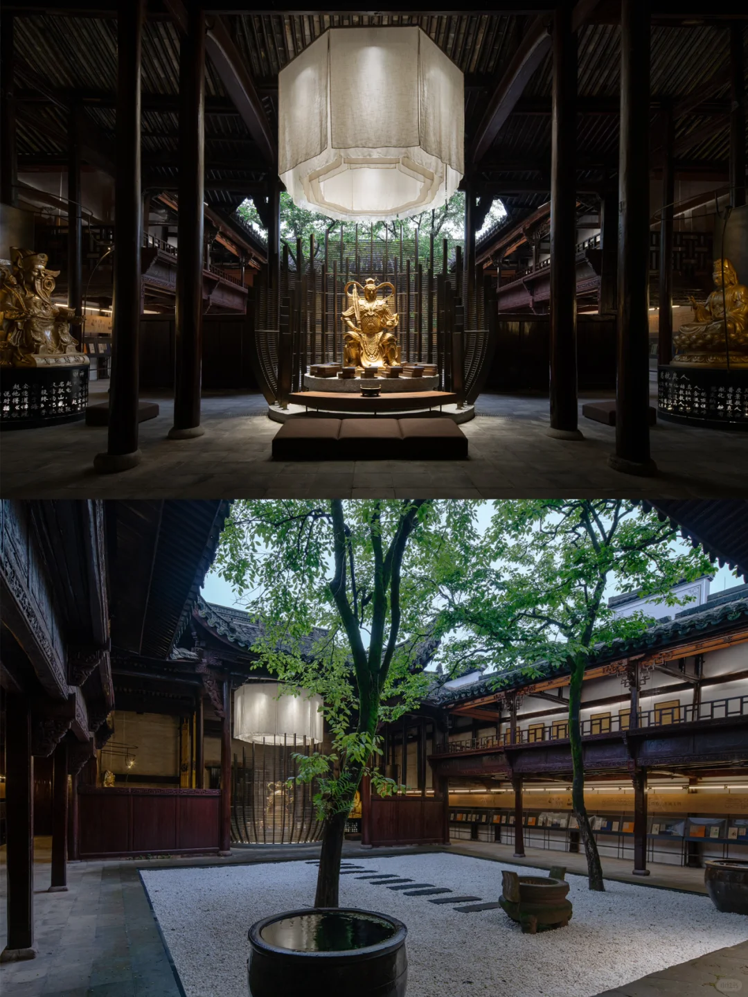 设计方将原本加建的隔断、玻璃进行了拆除,重塑了空间的行走动线,中庭重新进行了清理与重塑,保留了原有院内的大树及水缸,让其成为整个空间的视觉中心,人环绕院落游走。把庭院变成纯粹的被看空间,串联着各个空间,绿意盎然引入建筑空间,让陈旧的古建充满生机。两边廊道除了作为连接前后殿的主要动线外,还增加了展示功能。
