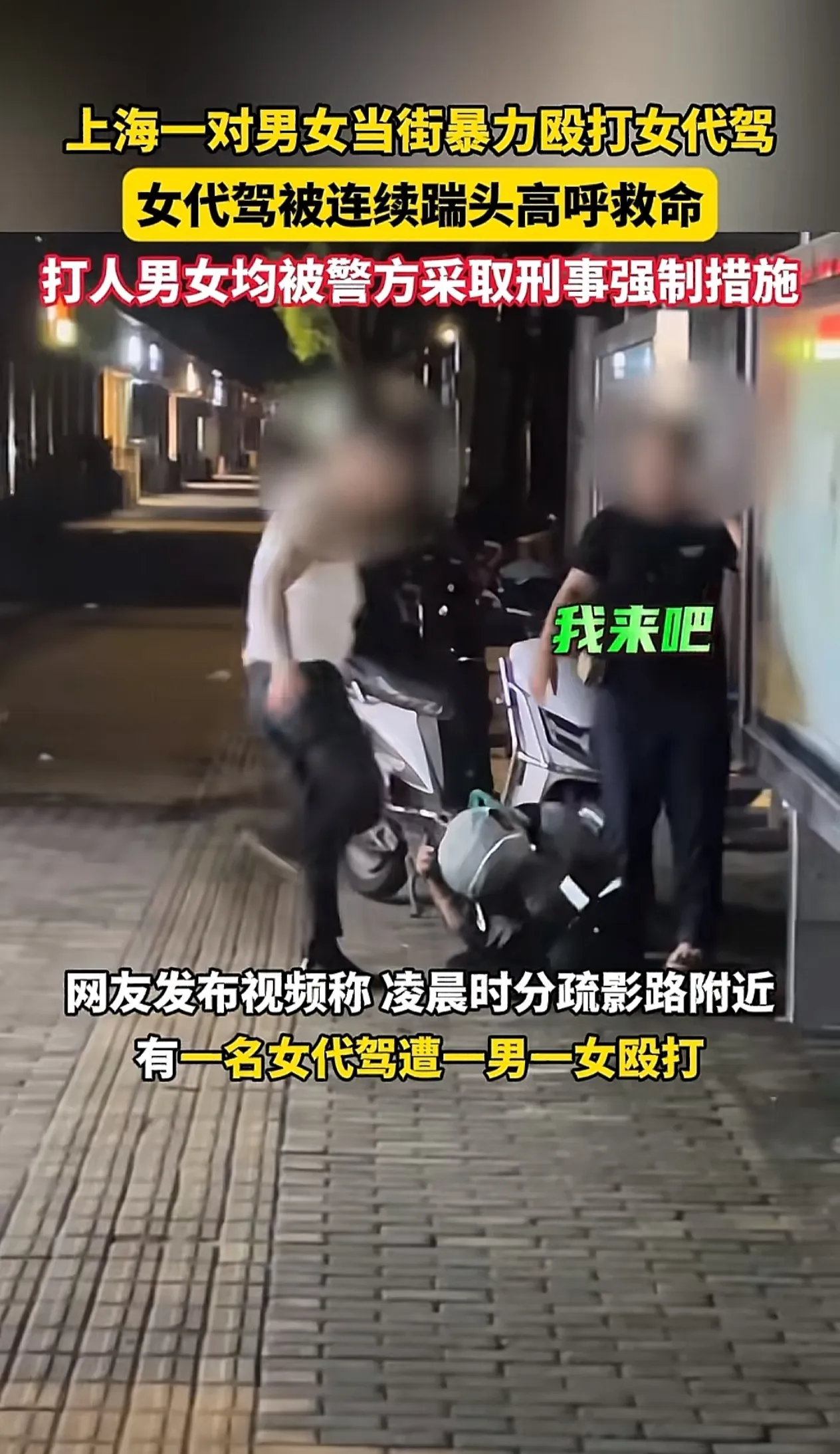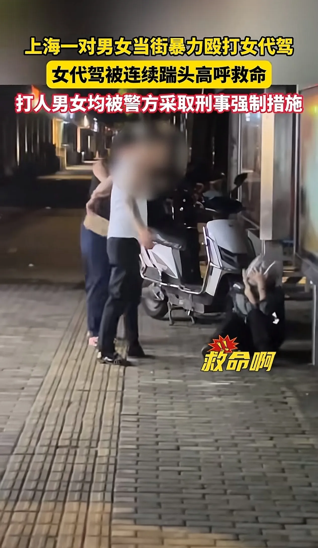 9月12日凌晨一点左右,在上海疏影路附近,有一纹身男伙同妻子,因口角问题暴力殴打女代驾,女代驾被打倒在地,撕心裂肺痛哭,大喊救命,被纹身男子依然,用脚猛踢头部。