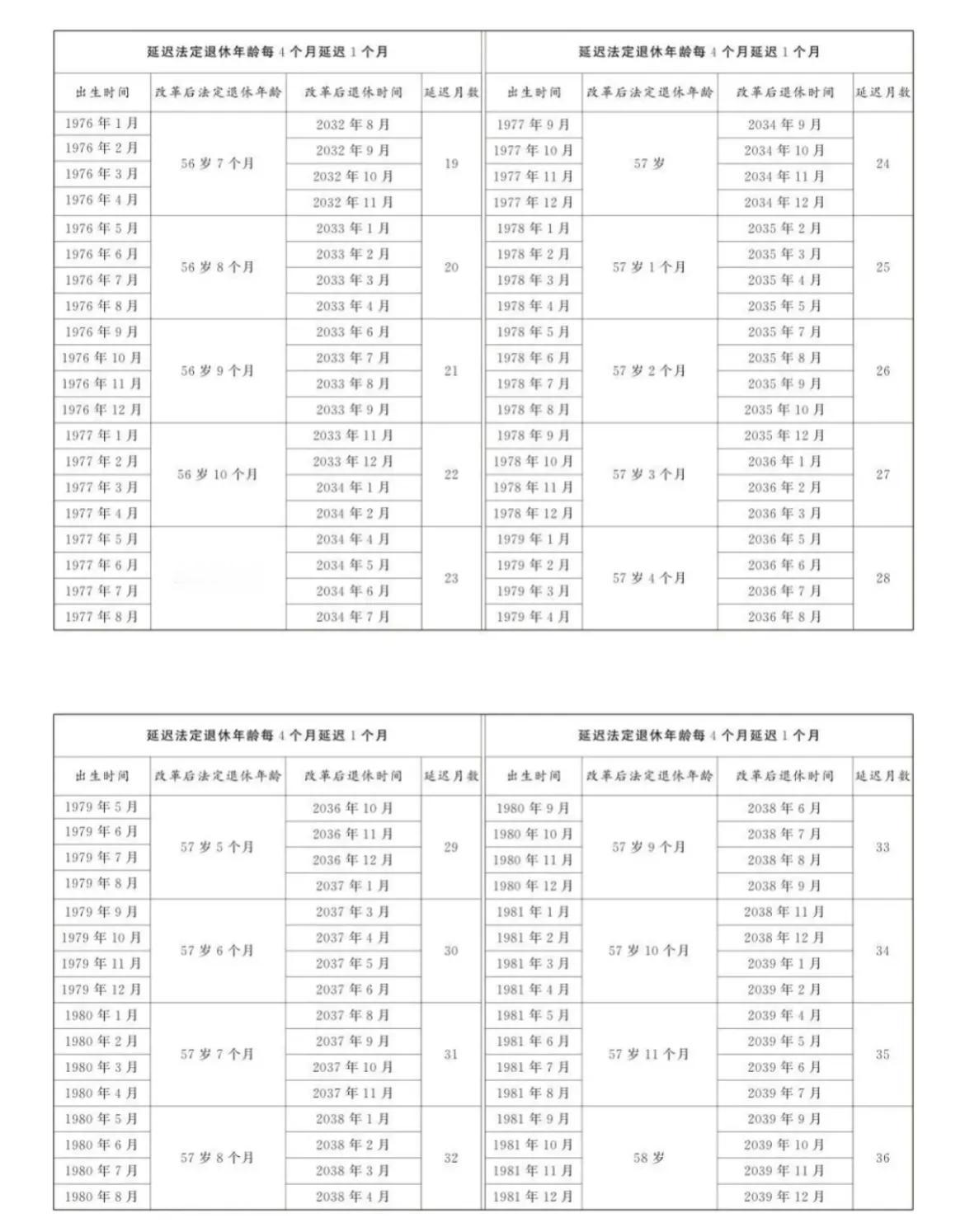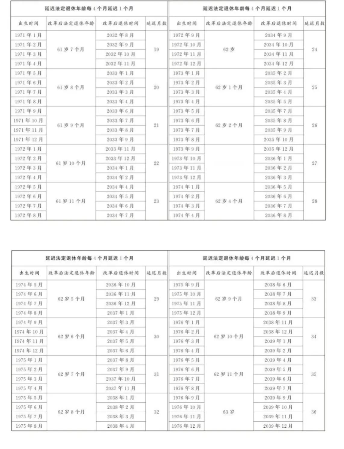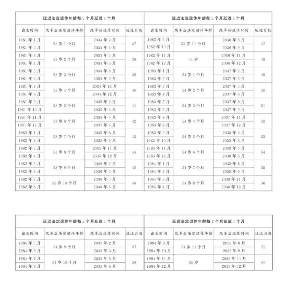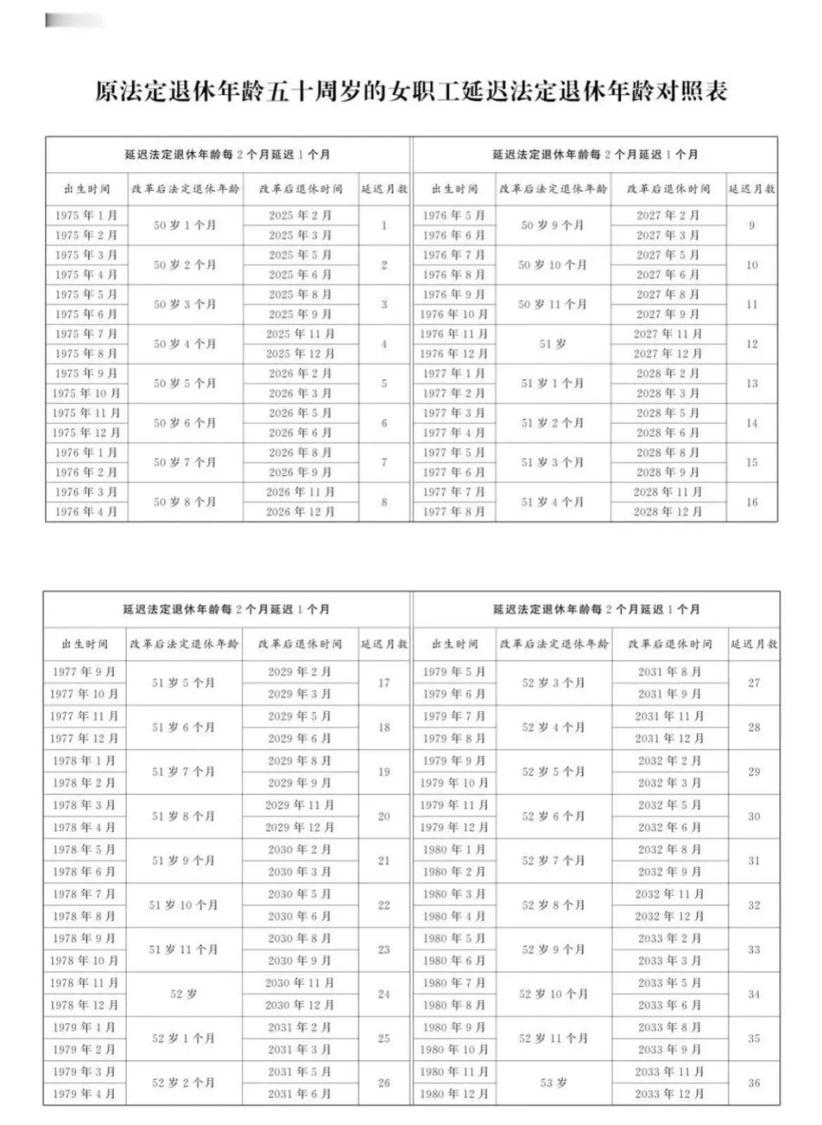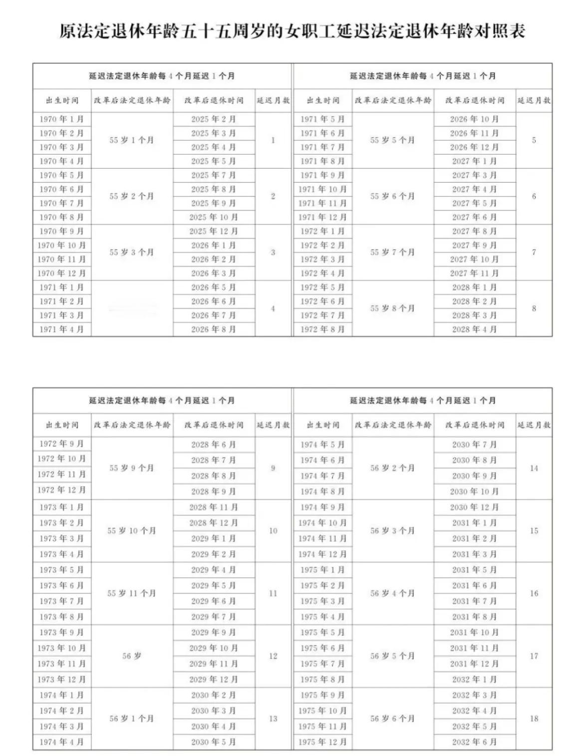 第十四届全国人民代表大会常务委员会第十一次会议通过了《关于实施渐进式延迟法定退休年龄的决定》,本决定自2025年1月1日起施行。 以下是男女职工延迟退休对照表,快来看看自己应该哪年退休吧!(网图侵删)
