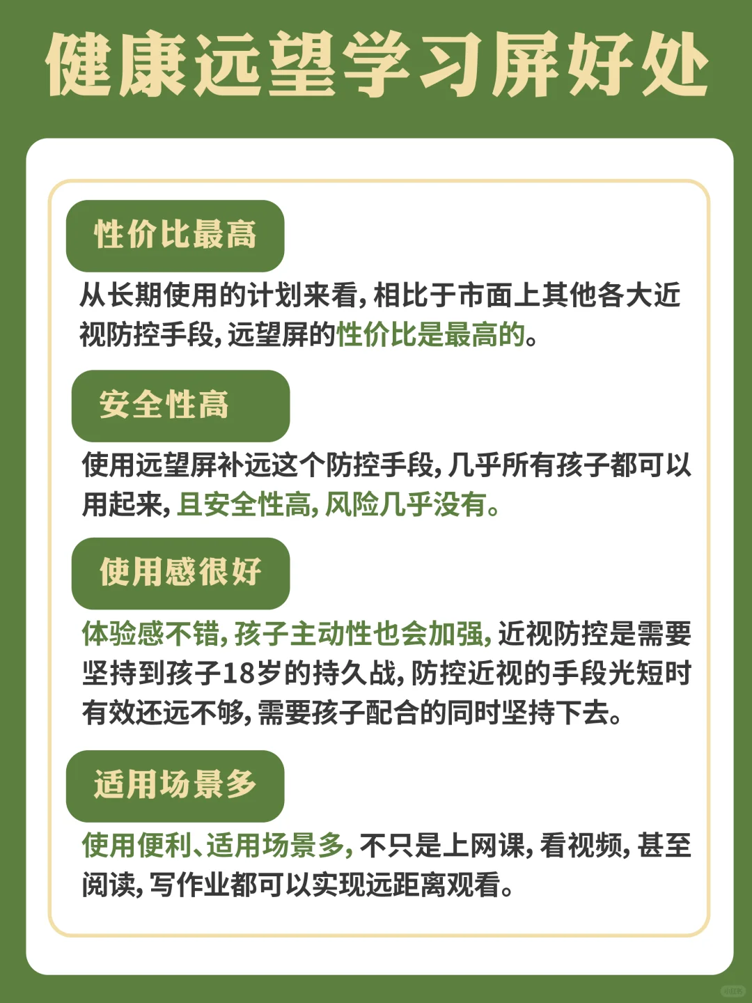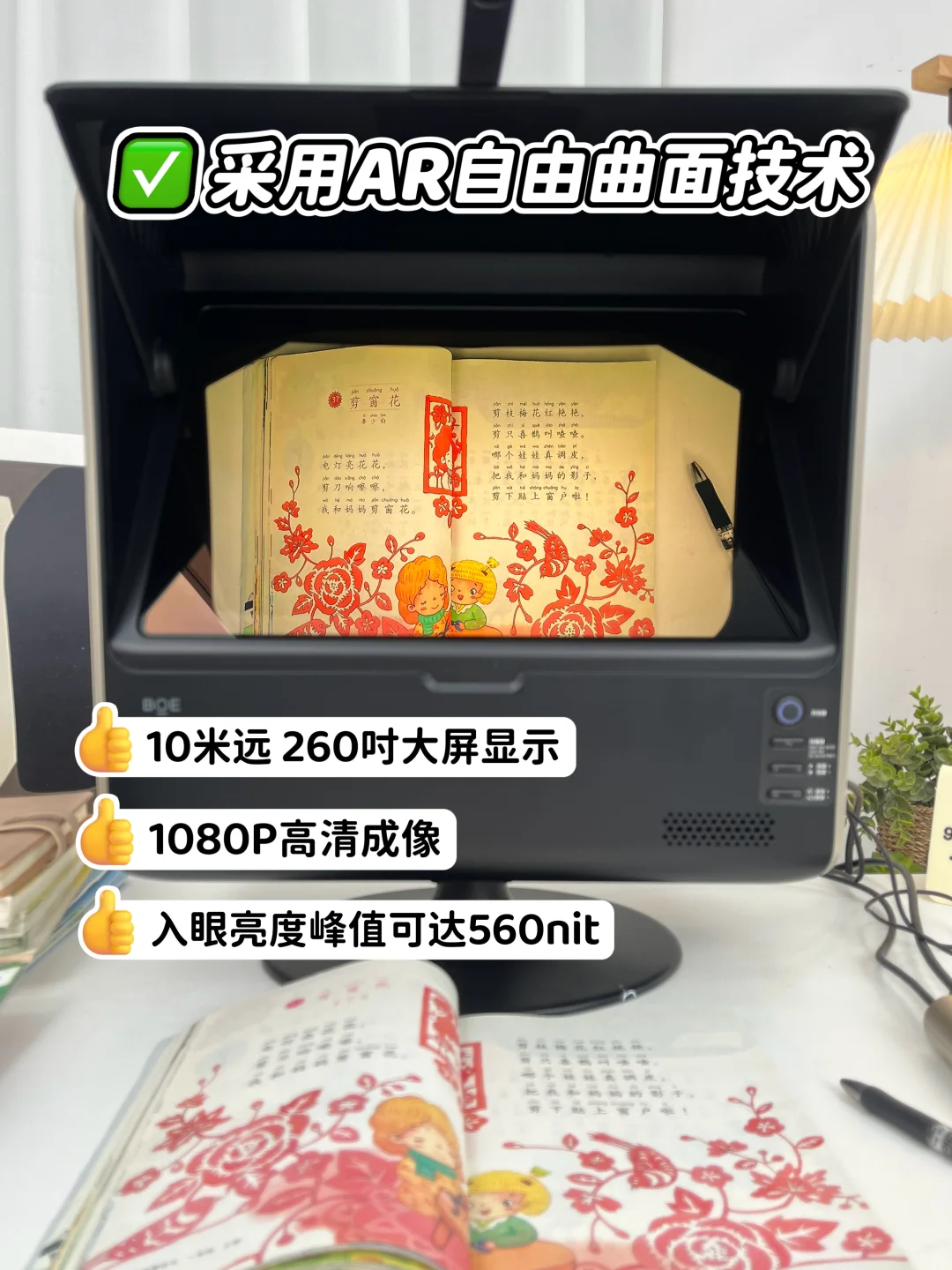 现在孩子的近视概率真的是越来越高了! 有一些妈妈总觉得孩子眼睛近视,是因为电子产品用的多!实际上,孩子眼睛近视,很有可能是因为长时间近距离的用眼睛❌ 为了呵护宝宝的小眼睛,我真的是做了多重努力,不光有多带着孩子做户外运动!甚至是安排了健康远望学习屏,这种远望屏究竟有什么好处呢? 最大的好处就是这种远视频可以达到望远的效果,相当于直接让孩子在户外看屏幕学习了,延缓近视发展的效果可以说是很好了🔍! 👉🏻 安全性高,风险几乎为0 👉🏻 使用体验好,孩子主动性强 👉🏻 使用便利、适用场景多,不只是上网课,看视频,甚至阅读,写作业都可以实现远距离观看 🙋🏻‍♀目前市面上的健康远望学习屏还是比较多的,怎么选到合适的呢 - ▪够清晰 成像足够清晰,能够清楚显示内容,无畸变、无杂光、无反光 ▪ 够亮 教学多媒体产品最大屏幕亮度应不小于300nits,这是《儿童青少年学习用品近视防控卫生要求》 ▪ 大小体积合适 体积适中,重量轻,不然会占用学习桌太多空间 - 经过多方对比🆚最后给我家👧安排了京东方健康远望学习屏-长鹰! - 它用到的AR 自由曲面技术模拟望远,从茛源改变孩子长时间无节制近距离用眼的不良用眼习惯 就可以在距离屏幕 40-50cm的距离下,看到10米远260吋的大屏影像,好比把孩子的课堂,直接拉到了户外,这样孩子的小眼睛就不会长时间近距离的盯着屏幕了💯 从最开始用这个护眼屏到现在,孩子小眼睛状态已经比之前好很多了,除了看东西的时候不容易揉眼睛了之外,两只眼睛的近视度数也得到了相应的控制🤩,以前基本上一个学期都得多近视50度呢,这学期孩子用下来,基本上只近视了20度而已✅还挺不错! - 而且它的各种显示参数也不赖,有全光谱、黑白阅读、色彩还原三种模式可以选择。官方宣传他的全光谱模式,应用了蓝光波峰红移技术,能做到低蓝光且有害蓝光几乎为0,平时上网课就让孩子打开全光谱模式,用着更安心。 - 现在我家娃可自觉了,一写作业就打开这个远望屏,还会做笔记,知识量蹭蹭往上涨🉑! 太满意啦! - 你们如果想杜绝近视“元凶”❌ 也要记得早点安排这个拥有强大护眼功能的远望屏🖥~ 护眼在线,早用早享受😭!