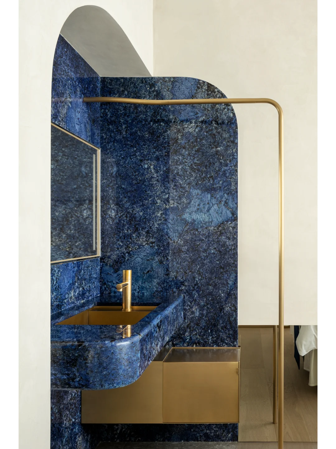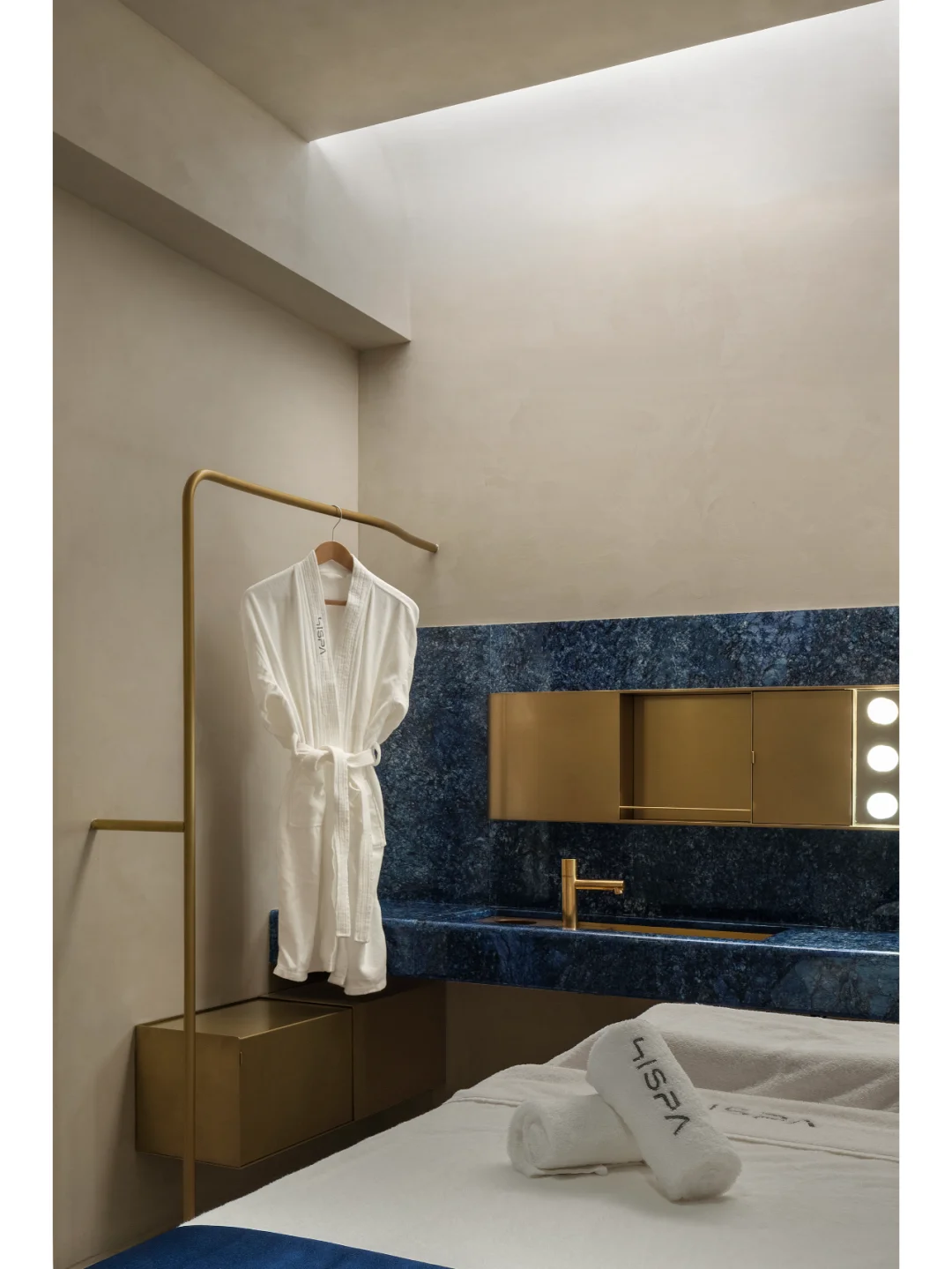 素色肌理涂料作为空间墙面基底,点缀以蓝色系列奢石化妆台与定制金属质感的洗手台及沐浴设施配件,呼应自然温润与现代精致的理想生活方式。