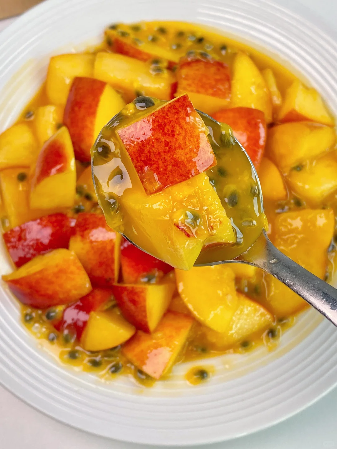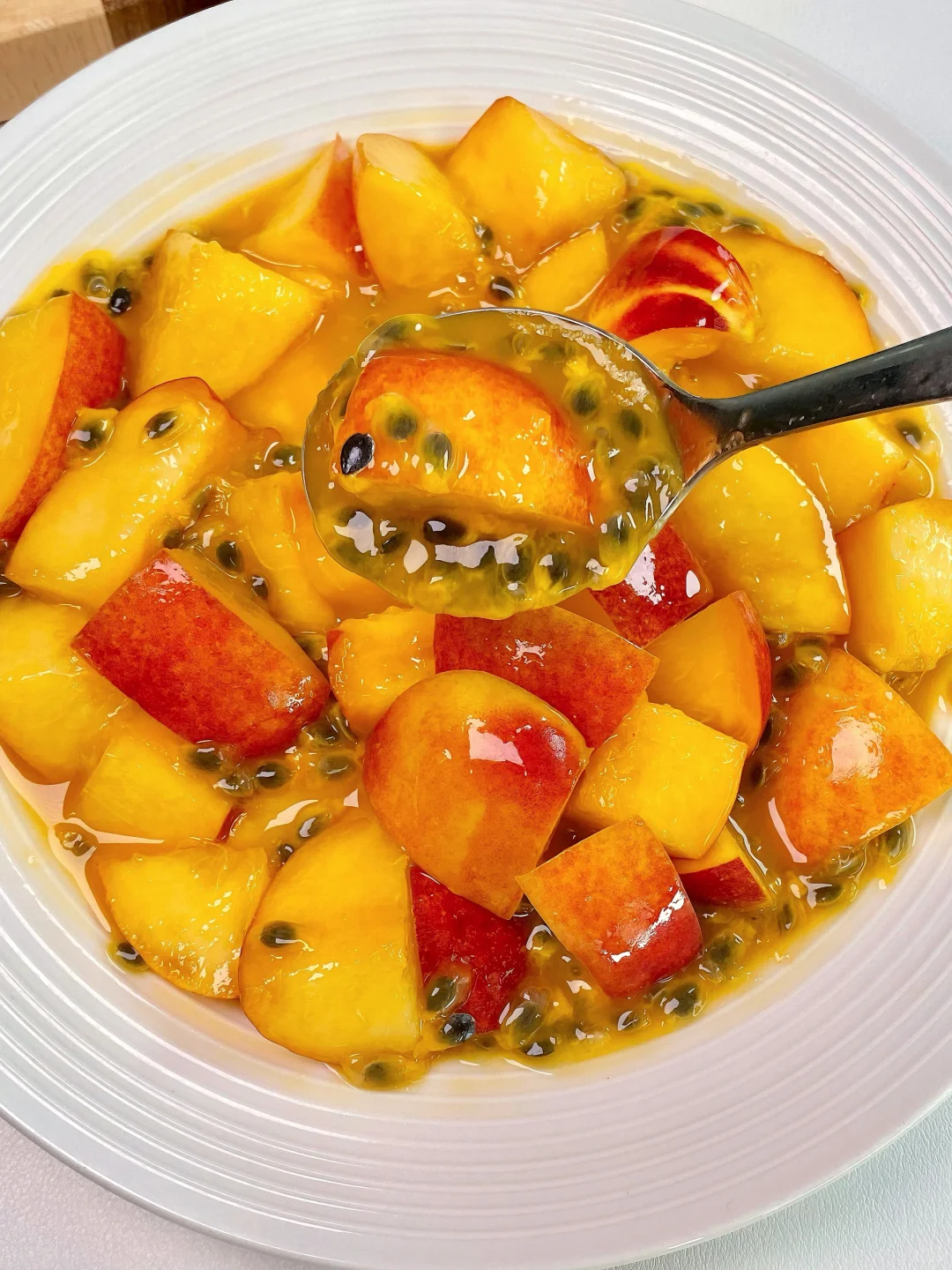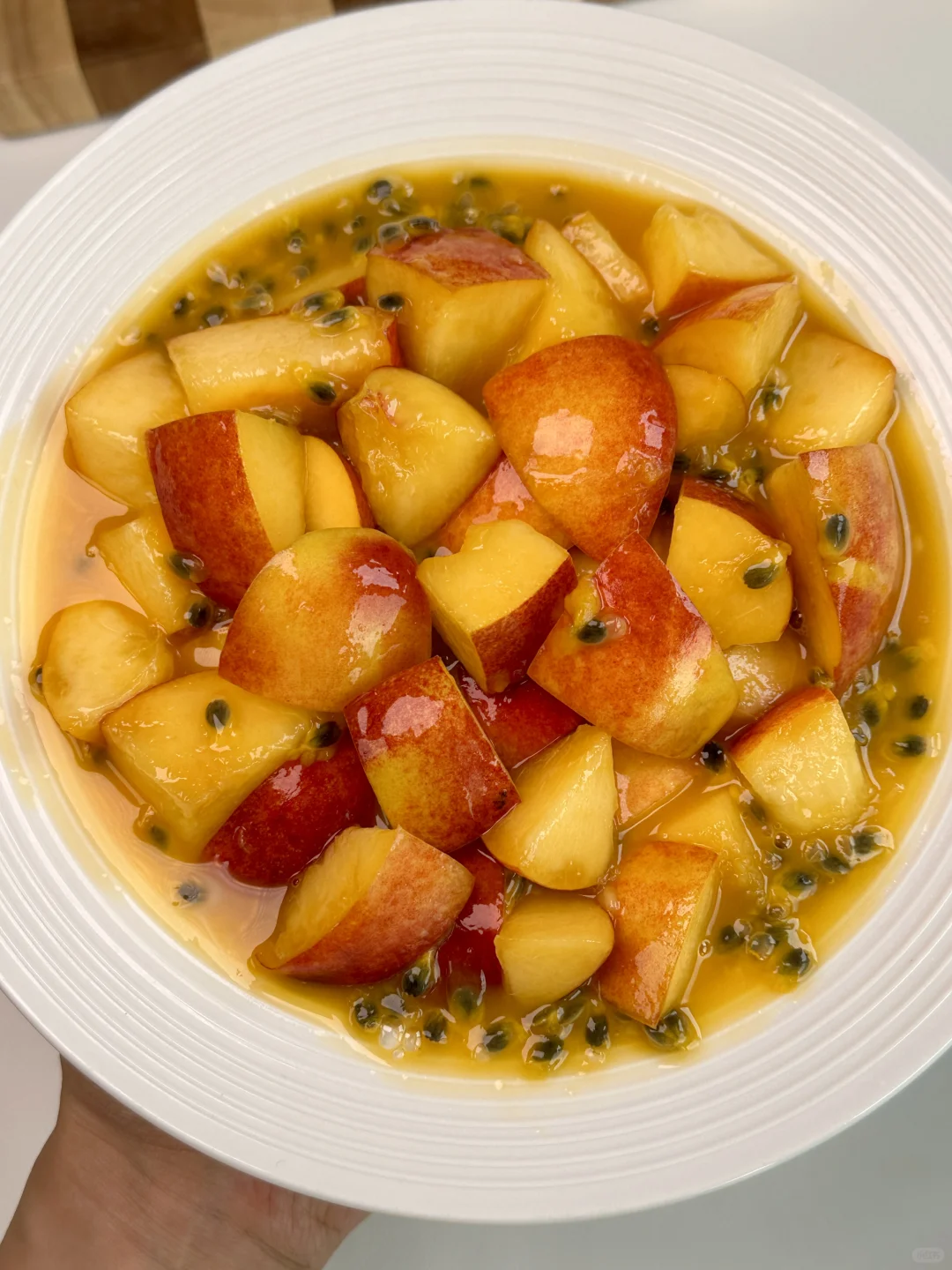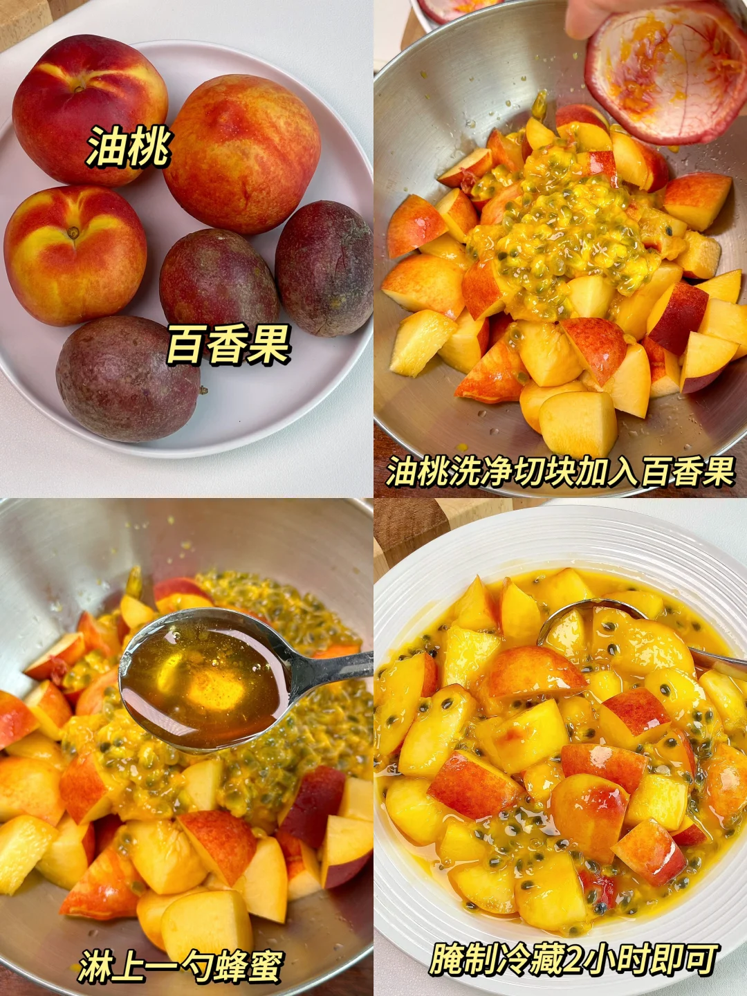 跟网友学的!据说这是桃子坠好吃的做法! 百香果渍油桃!酸酸甜甜的真的好好吃!! 一口下去巨清爽巨解腻!!!桃子腌入味了,好吃不腻!喜欢吃酸的朋友一定要试试! 做法简单到有手就行!!✅具体做法在图上!