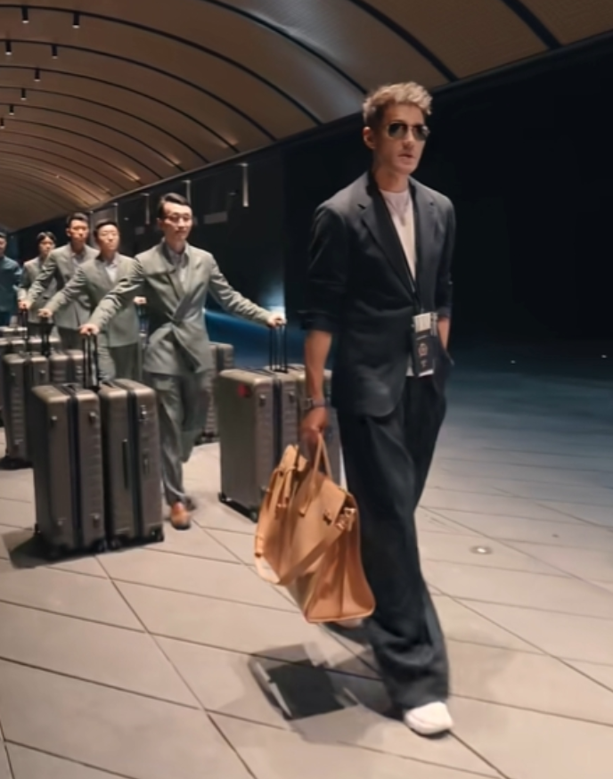 胡兵去参加伦敦时装周,至少携带了20个大行李箱;帮他拖箱子的工作人员,至少有4个;单单这些行李箱,就价值几十万!
