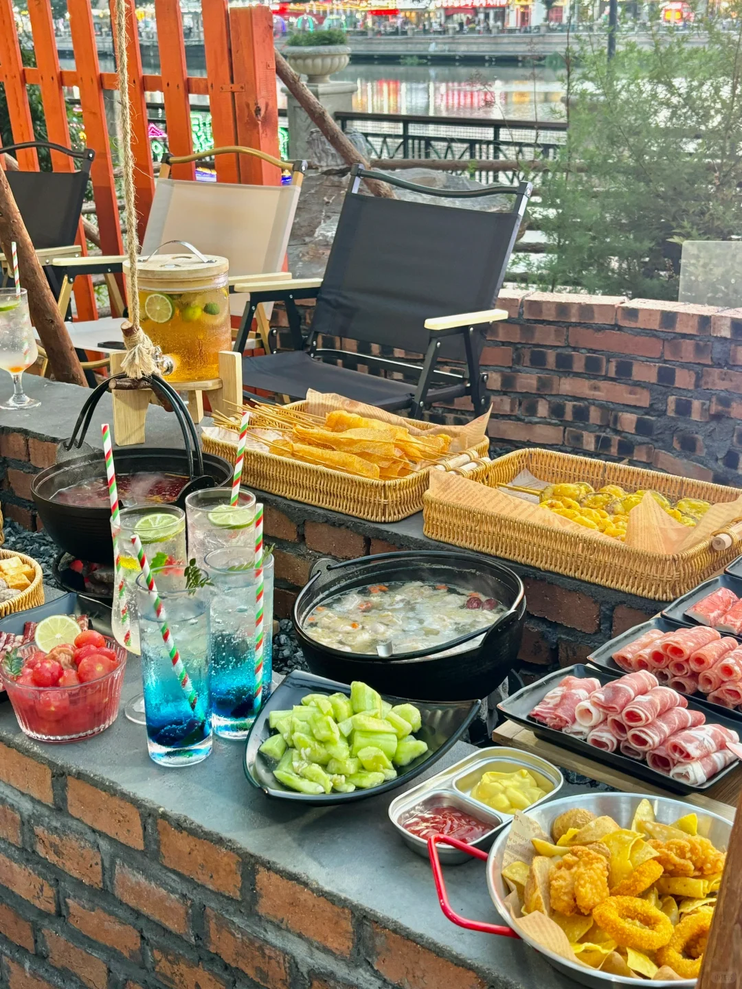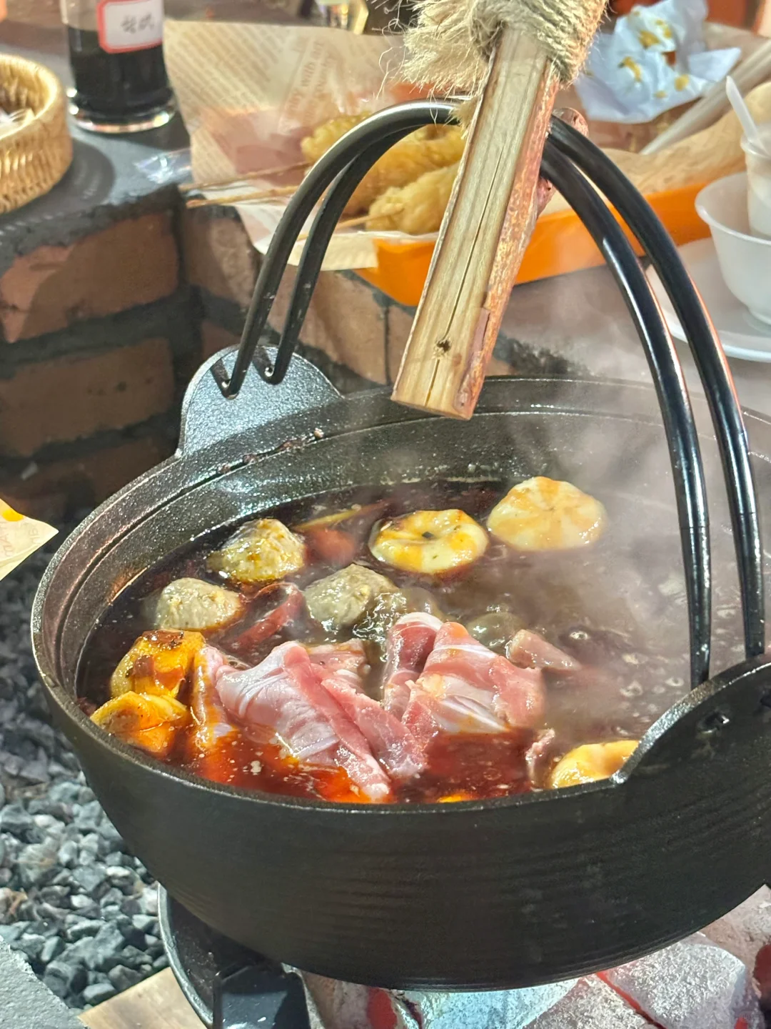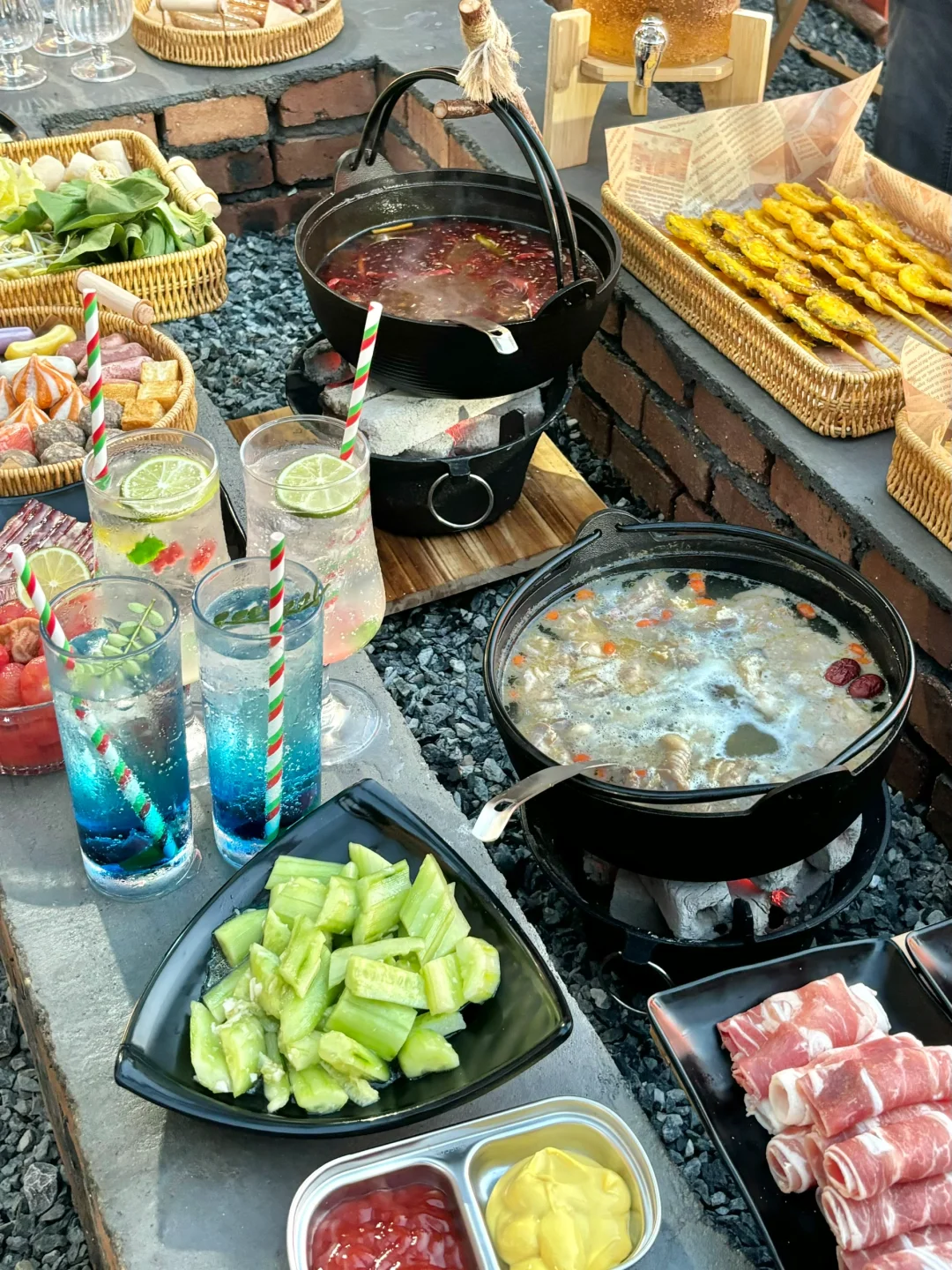 这绝对是宿迁吃火锅的next level! 日落晚霞➕湖景➕吊炉➕美景,主打一个氛围感!三五好友一起下了班过来小聚一下真的太惬意了👋🏻 如果想体验吊炉火锅就选在院子里!真的太有特色了!碳火烧置,辣锅更香!如果怕热可以选择室内,有空调! 他家除了基础火锅菜品还有特调饮品和炸串,味道也都挺好的 🏠爽野吊炉火锅 📍金田湖畔西侧广场浪漫街区01号