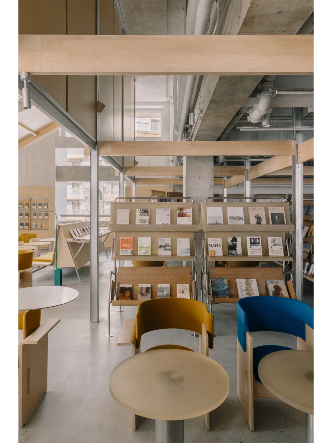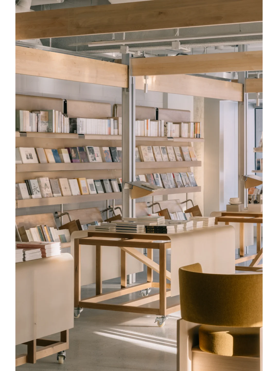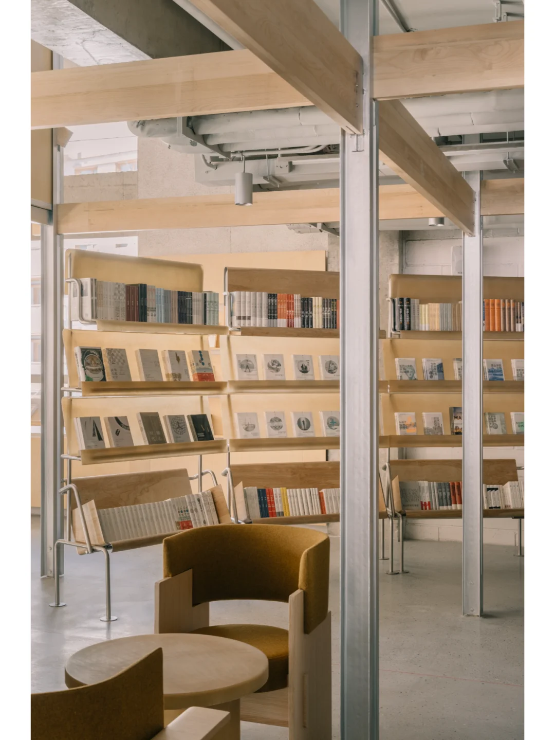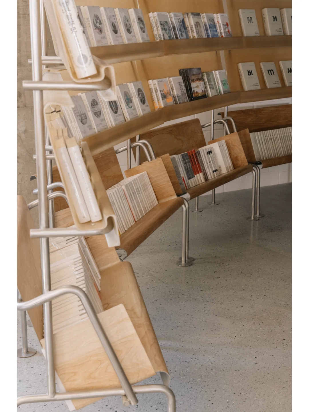 书架也是轻盈的半透明的,用玻璃钢制成带有圆角的层板固定于不锈钢支架上。日影推移,玻璃钢的纤维质感过滤柔化了坚硬的光线,蜜蜡色的光在空间里震荡流淌。