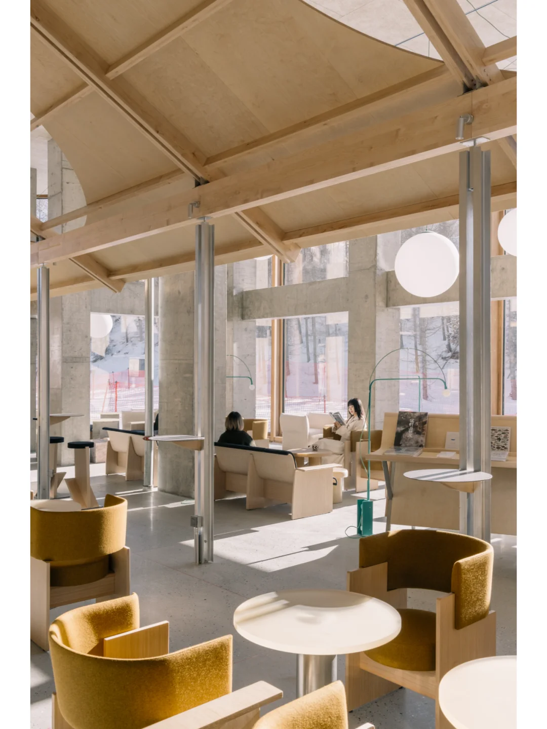 除了吧台和网格框架是固定的,家具和书架都是是灵活的放置并浮于地面上,从而保证了内部空间的连贯性,灰白色石材地面是一片向远处的山脉和近处的雪坡树林延展的地形。