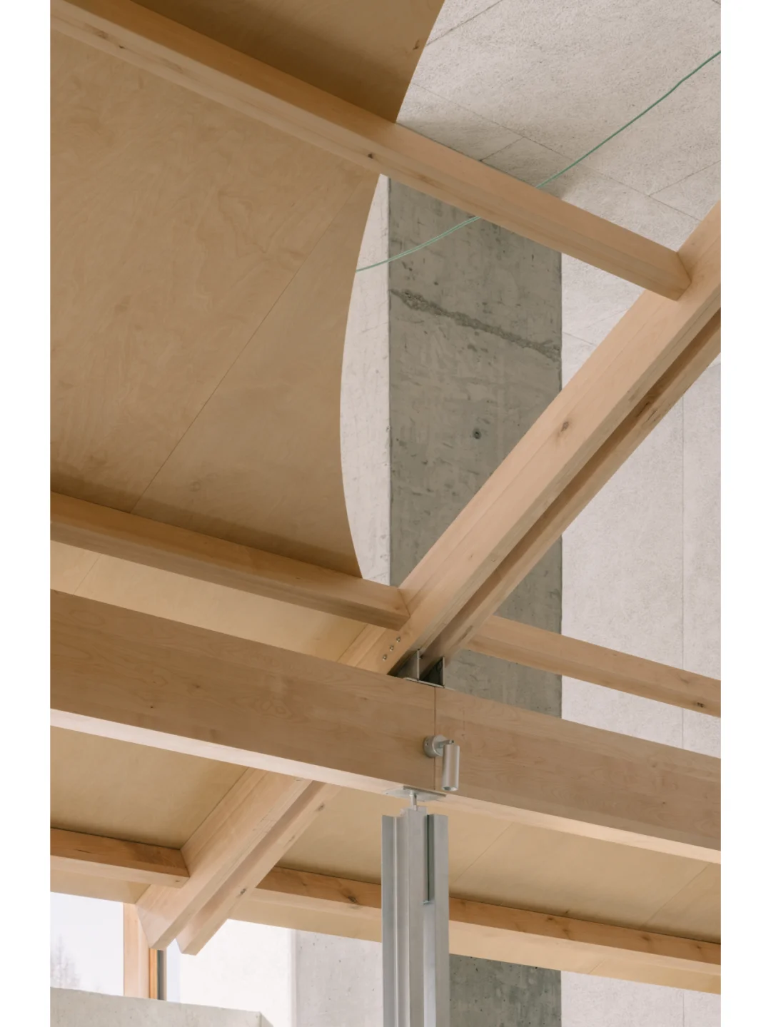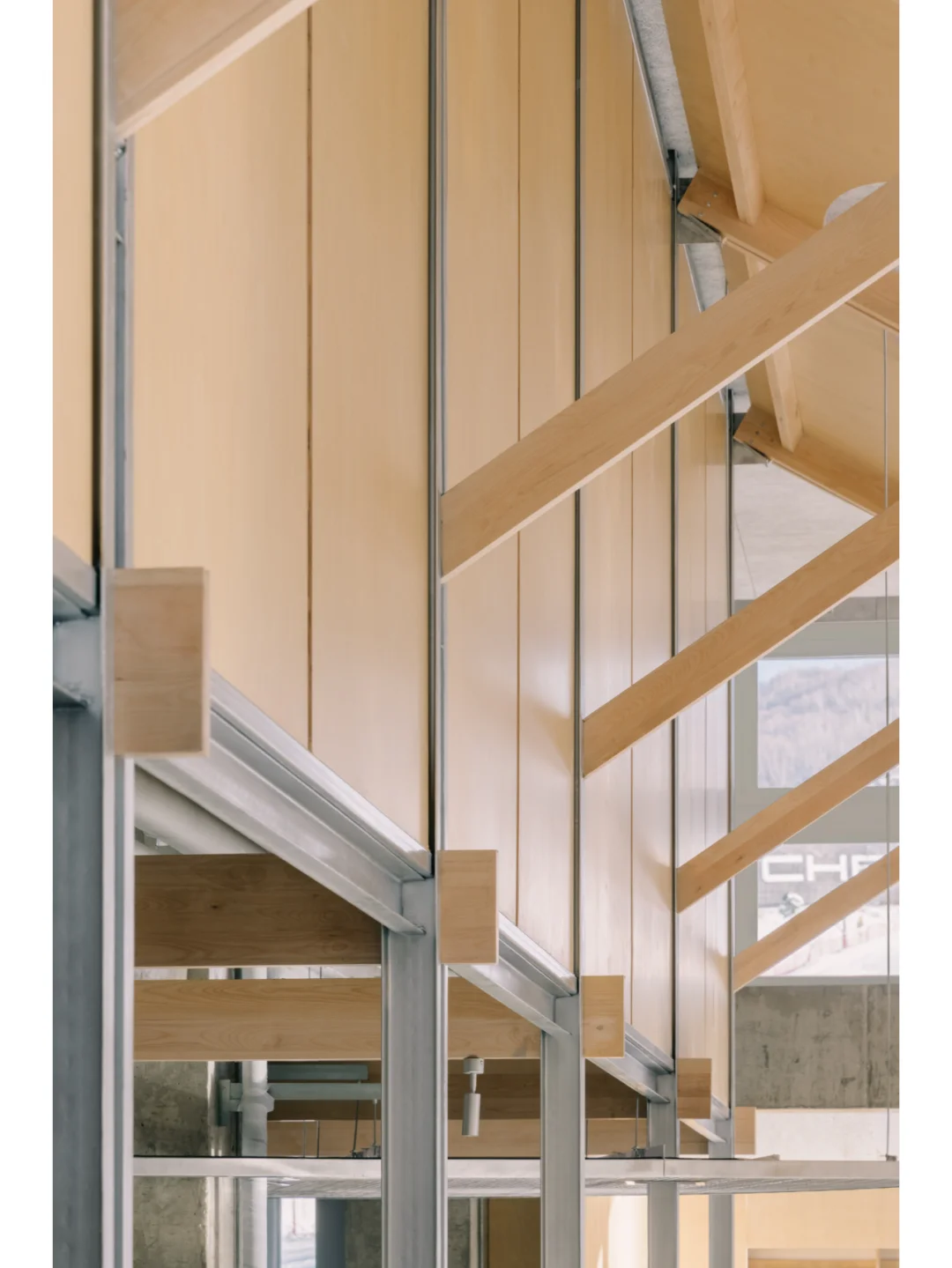 通过把建筑朝南的两层立面打开,覆以大片通透的木框落地窗,从而建立了新的内部视角,看向白色雪坡上黑黝黝的小树林。北方的冬日阳光低低地倾斜落下深长的影子,南面高处的光线,可以一整天从不同的角度深远的洒入北向的角落。