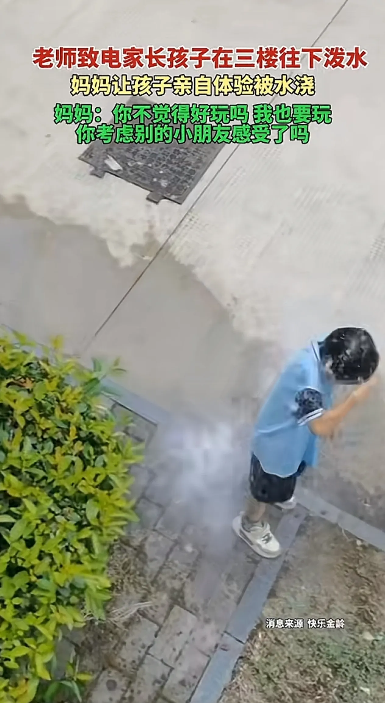 浙江男孩从楼上往下泼水浇人觉得好玩,母亲教育方式让人泪目!9月14日来自浙江金华的周女士,在家休假没有上班,平时自己和丈夫上班很忙,孩子从小都是其奶奶帮忙照顾。