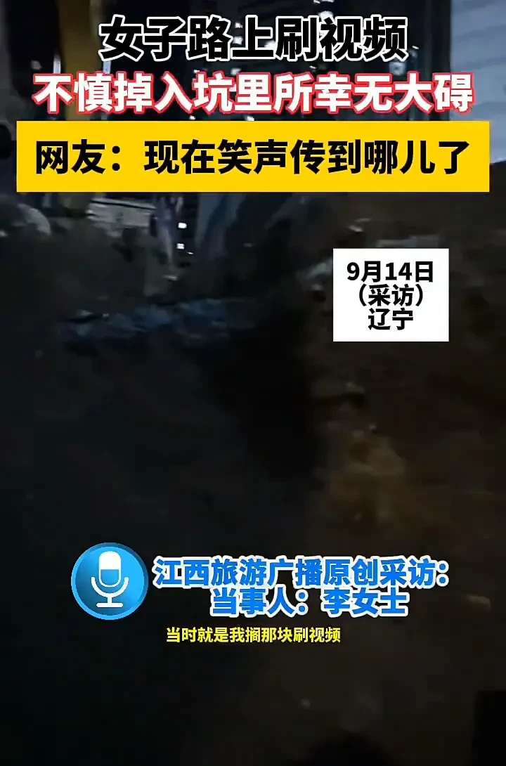 近日,辽宁一名女子在走路时顾着玩手机刷视频,完全没注意脚下,便直接摔进了工人作业时留下的大坑,所幸坑内不深,女子穿着长衣长裤,并没有受伤,不过很快引起周边路人的围观,让她感觉有些丢脸。