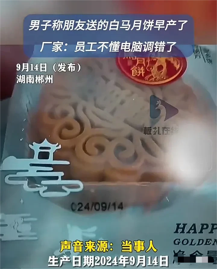 9月12日,湖南郴州一名男子发视频称,朋友刚送给自己的“白马”月饼,包装上写的生产日期却是9月14日,因此质疑厂家对日期作假。对此厂家回应,是员工不懂电脑调错了,已经对师傅进行处罚,会注意。