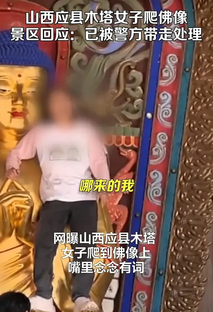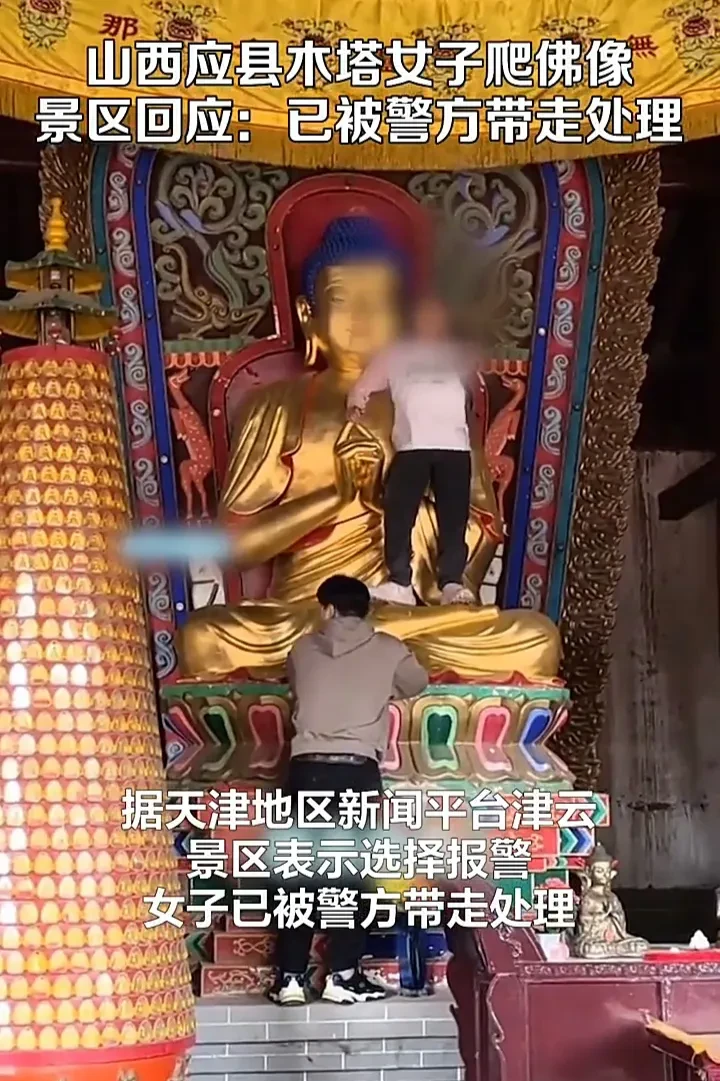 9月14日,山西朔州一位网友发视频称,一名女子爬到佛像上,嘴里振振有词地念叨着“哪来的我”,现场有人试图将她拉下来,但她却始终不肯。之后景区选择报警处理,该女子最后也被警方带走调查。