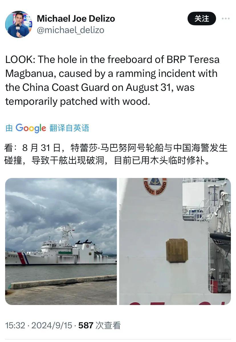 新加坡联合早报今天(9月15日)报道:“菲律宾海岸警卫队一艘船只,在主权有争议的南中国海岛礁停泊五个月后,完成任务返回港口。” 评几句:菲律宾海警发言人嘴硬说9701号船是完成任务返回港口。然而,事实上,菲律宾海警9701号船在非法滞留仙宾礁长达5个月后,不得不狼狈撤离,这背后可能基于三方面的原因。首先,在我海警的严密监视与防守下,菲海警9701号船难以获得补给,目前已有船员出现“脱水”症状。其次,大型远洋救助拖船“南海救116”始终在仙宾礁附近待命,若菲律宾方面继续赖着不走,我们有能力采取拖离措施。最后,菲律宾记者今天公布的9701号船照片(图二)显示,该船干舷部位出现破洞,且仅用木头进行了临时修补,这无疑存在严重的安全隐患。