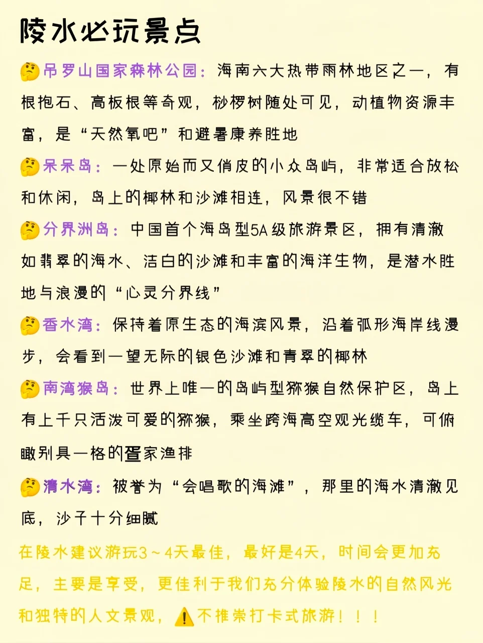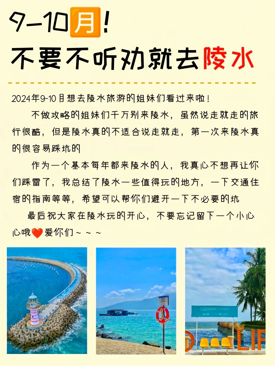 9,10月份很适合来陵水玩的,相比于暑假人会少一点 但是去陵水旅游不做好攻略真的会哭惹😭😭😭熬夜总结的这份陵水旅游攻略指南!需要的姐妹可以参考