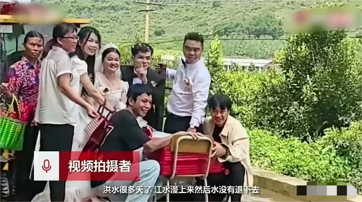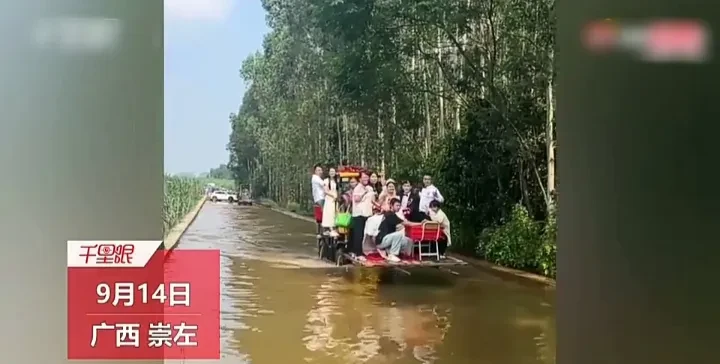 9月14日,广西崇左由于连续多天洪水未退,路面积水严重,一对已经订好结婚日期的新人,便决定用铲车来接亲,只见新娘穿着婚纱,与新郎和亲友们站在铲车上,即便没有豪车,脸上依然笑得十分香甜。