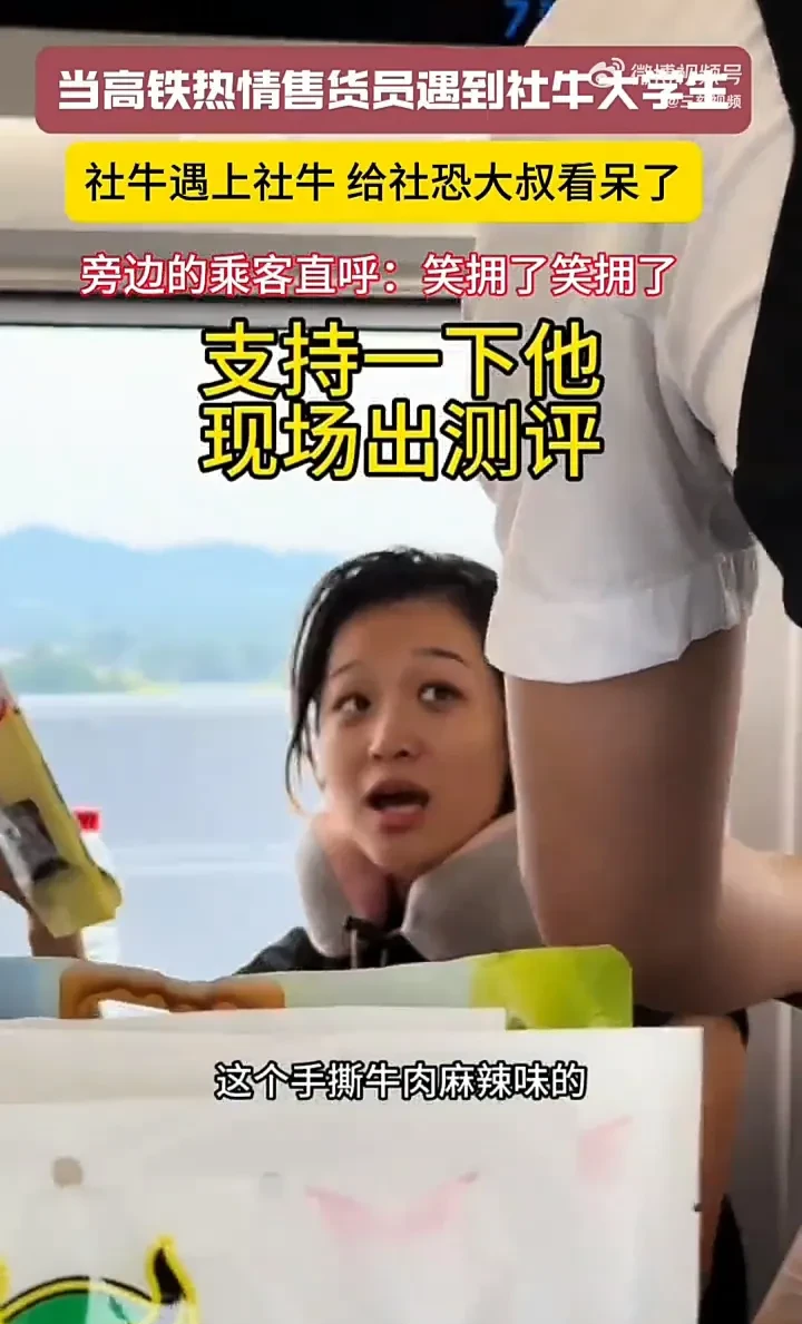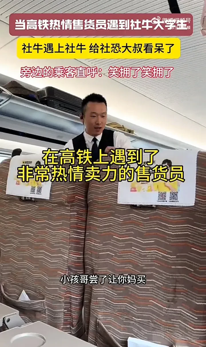 9月13日,江苏一辆高铁上,一名男售货员正在热情地推销零食,这时一位女大学生伸手讨要,吃过后频频夸赞,引得他更加激情游说,嘴里不断爆出梗来,最后成功让大学生购买,其他乘客也都欢笑不停。