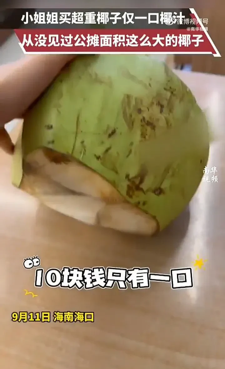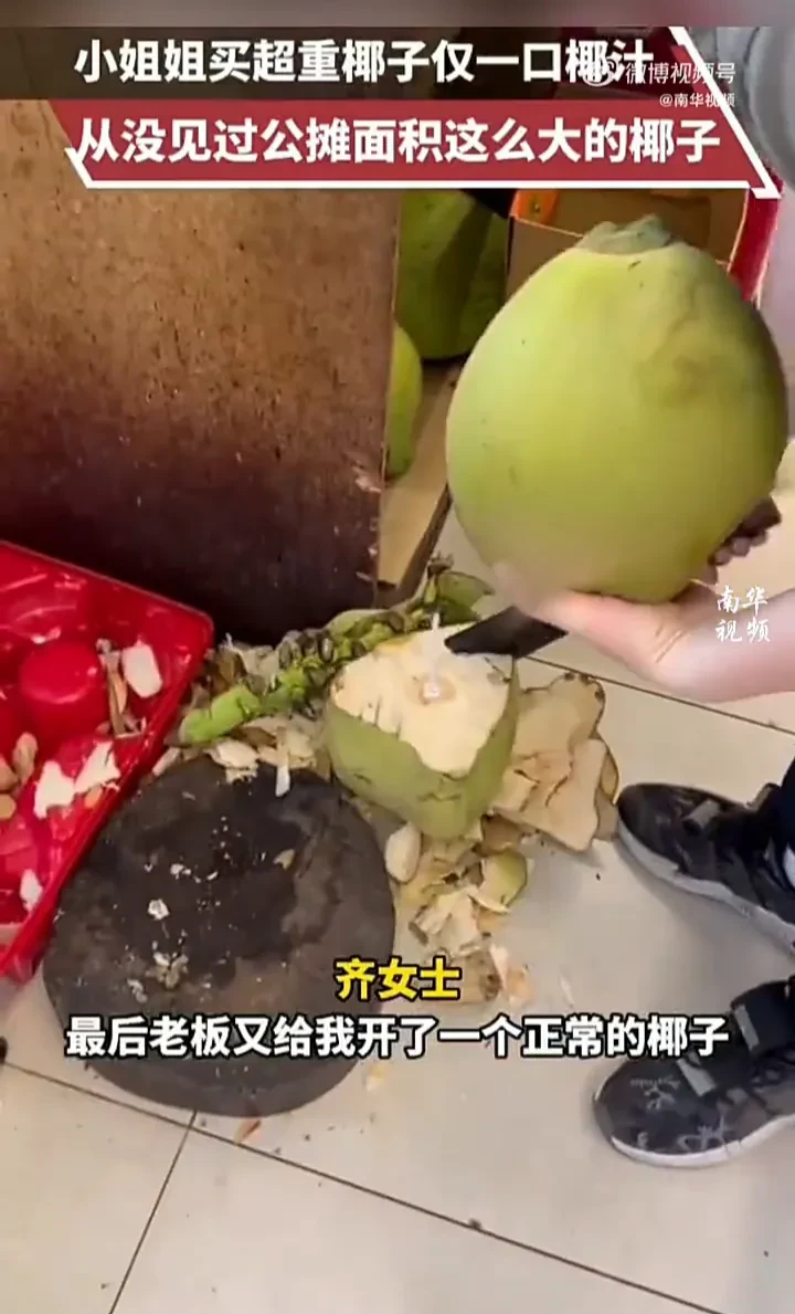 太搞笑了!近日,海南海口一名女子发视频称,自己在楼下买椰子时,老板信心满满地推荐了一个最重的椰子,结果自己喝了一口就没了,打开一看,居然是个中看不中用的椰子刺客,最后老板又给自己重开了一个。