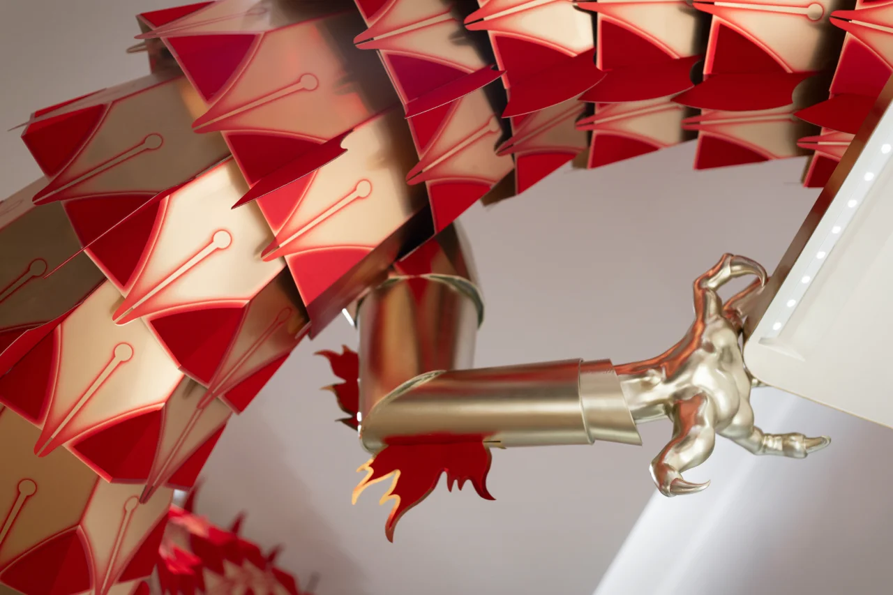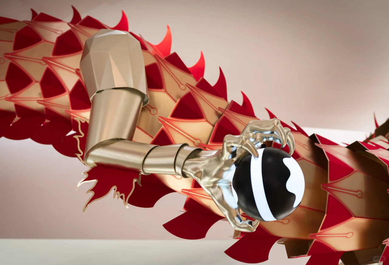 从万宝龙系列中的奢华形状和图案中汲取灵感,精心制作龙的鳞片和尾鳍,以反映其标志性的笔尖, 利用先进的3D技术,将龙的形象呈现得更加立体、生动,为顾客带来了震撼的视觉效果。
