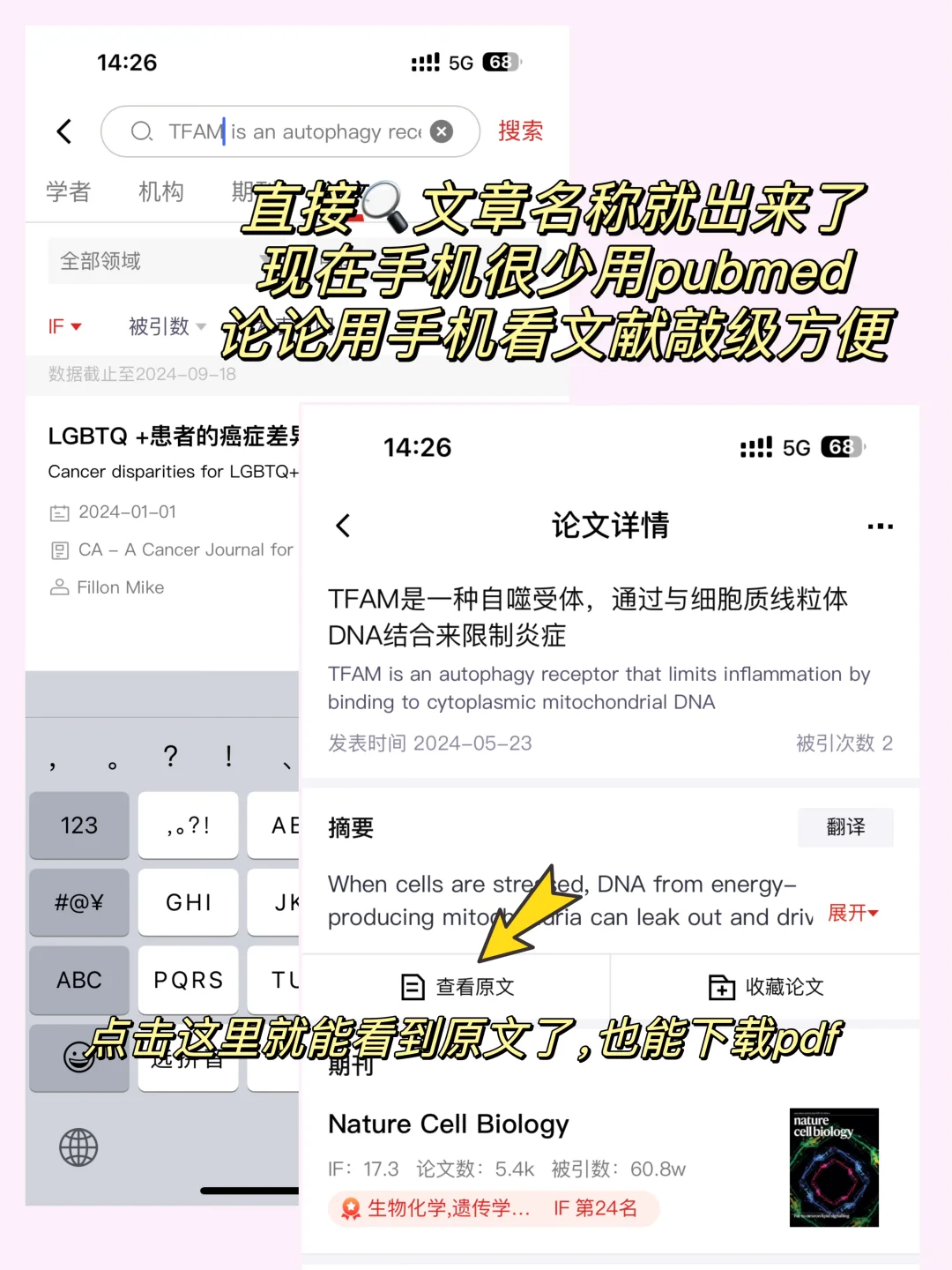 ✅不在实验室时我用手机看文献比较多,尤其是粗看文献基本就是用手机浏览了,手机上用pubmed界面不是很简约清楚的感觉……反正不太爱用。