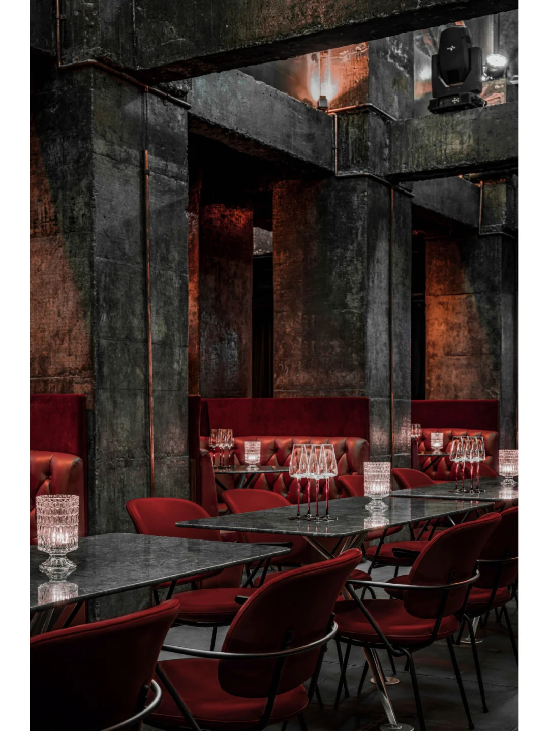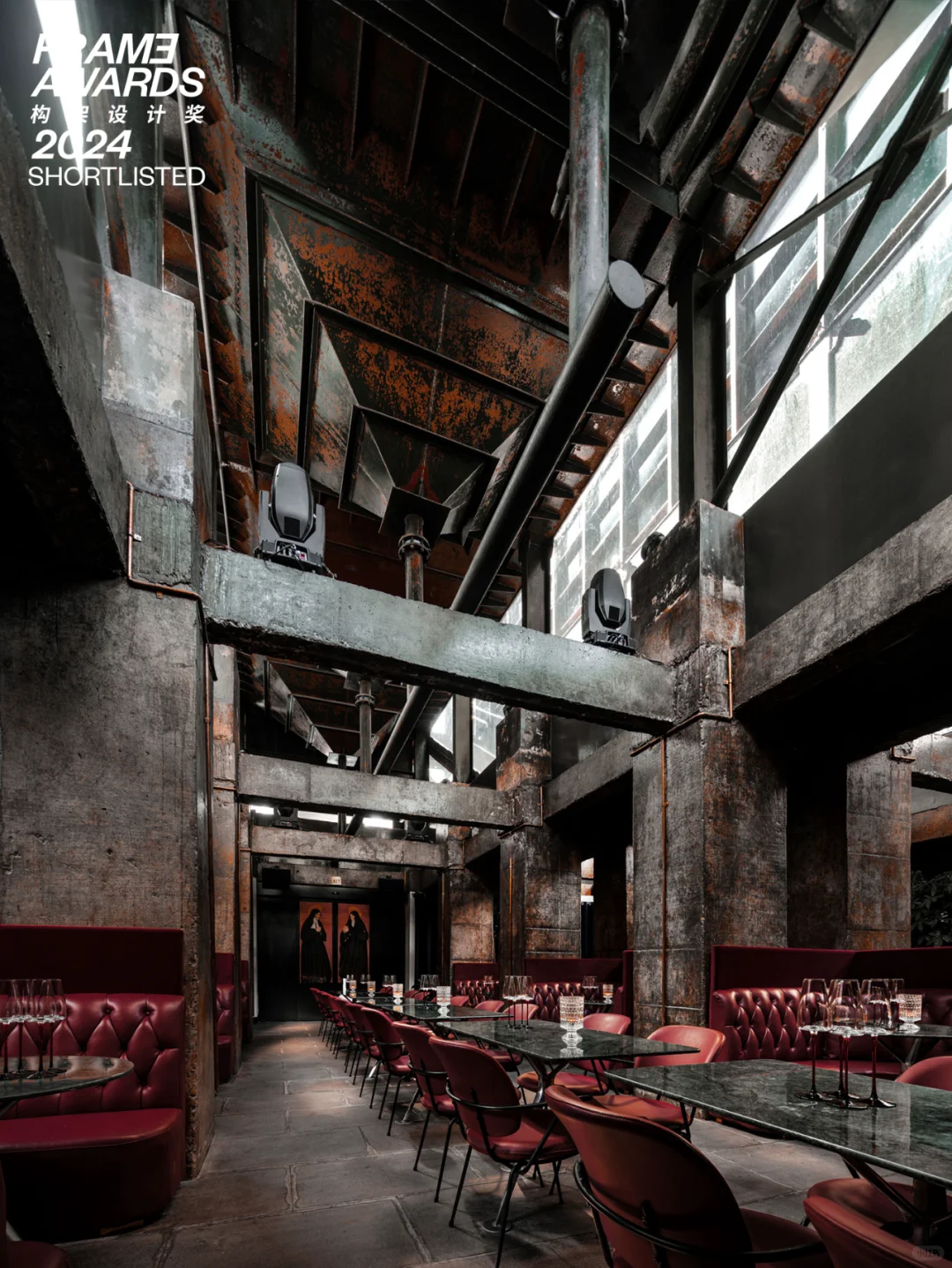 设计以下沉式的设计保留了2个巨型水箱和36根结构柱,抬头可见原有污水处理厂底部的锈迹斑斑。同时,用心地处理地下渗水的问题,以保证业主的经营。残破的材料与生命力互为联系,大理石和皮革水泥纹理结合灯具和镜子,延伸了空间的进深。将原有的水箱和水池改造成餐厅、办公室和VIP空间。