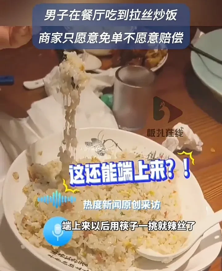 9月17日,江苏常州一名男子发视频称,自己中秋节到一家餐厅吃饭,点了一份蛋炒饭,结果端上来的炒饭却“拉丝”了,还有一股酸臭味。事后餐厅表示只愿意免单,但不接受根据相关法律进行赔偿。