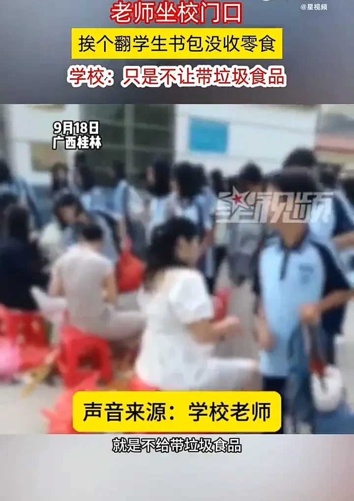 9月18日,广西桂林一所小学门口,一群老师坐着检查学生们的书包,将零食全都没收后,才允许学生们进学校。事后校方工作人员回应,可以带零食,但不能带辣条之类的垃圾食品,是为学生的健康考虑。