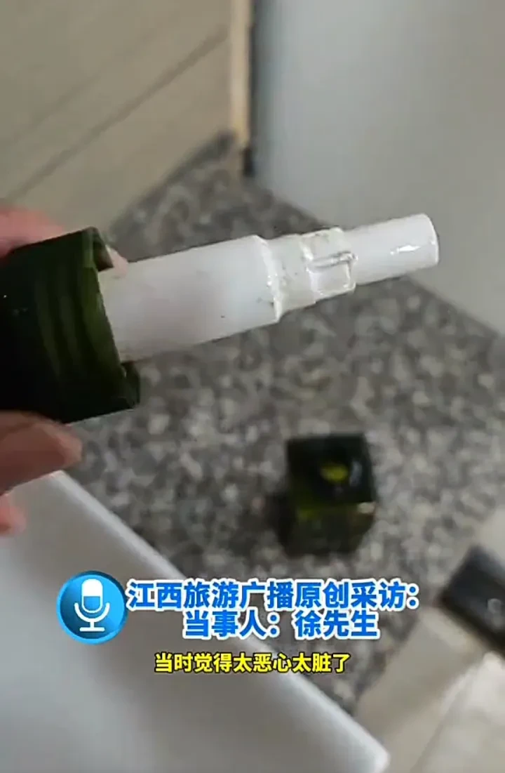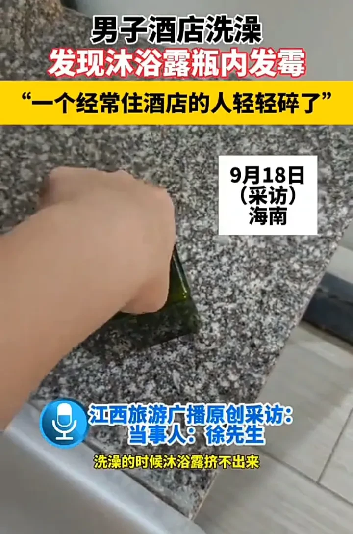 近日,海南一名男子发视频称,自己在酒店洗澡时,发现沐浴露瓶子里挤不出沐浴液,于是打开查看,结果看到瓶内已经发霉了,顿时感觉太脏太恶心了。这对于经常出差住酒店的他来说,无法接受。