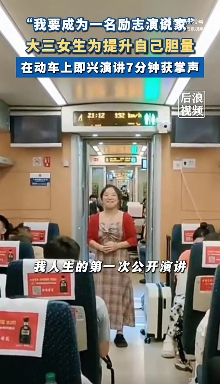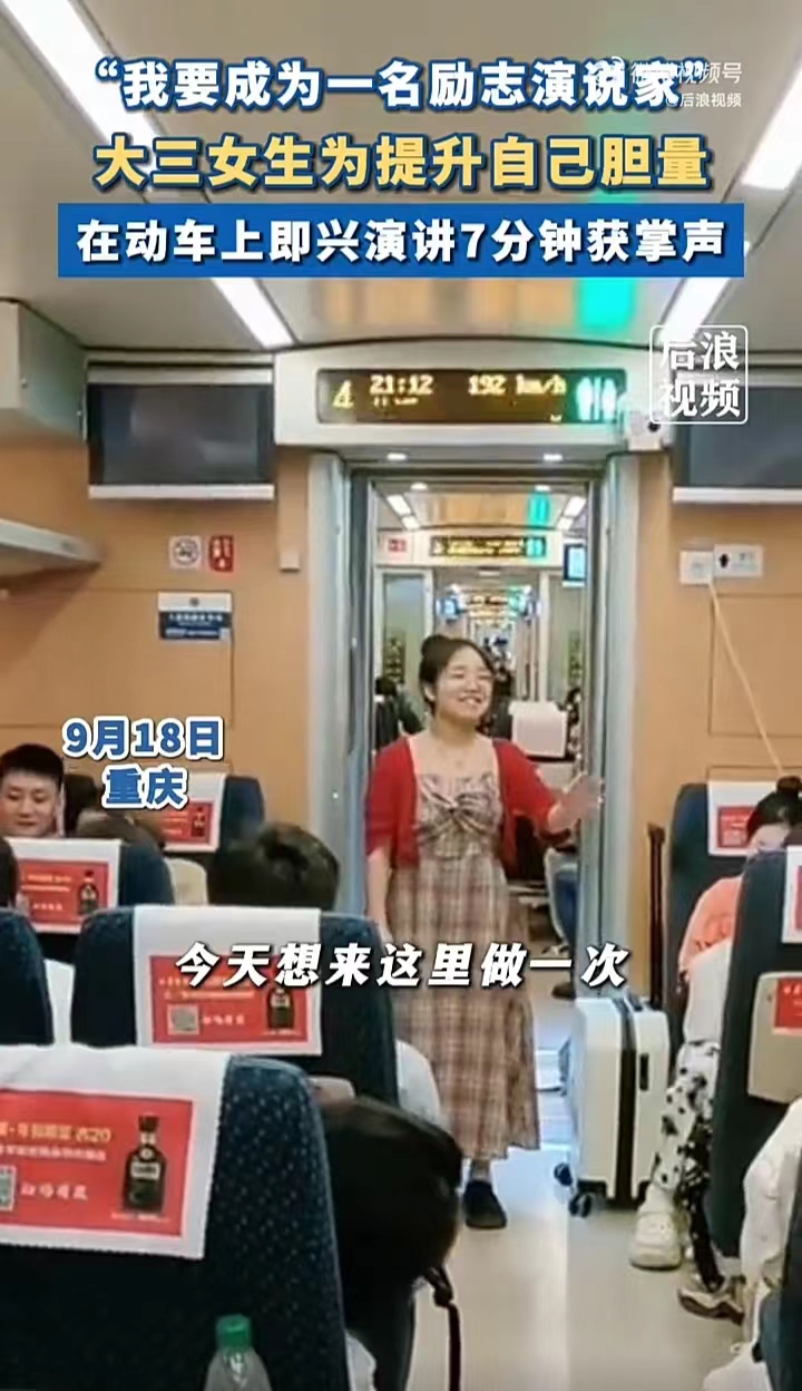 9月18日,重庆一名大三女生在乘坐动车时,面对整个车厢的乘客,来了一次7分钟的即兴演讲,获得了众人的阵阵掌声。该女生表示,自己想成为一名超励志的演说家,当时去演讲是为了锻炼胆量,很感谢乘客们对自己的鼓励!