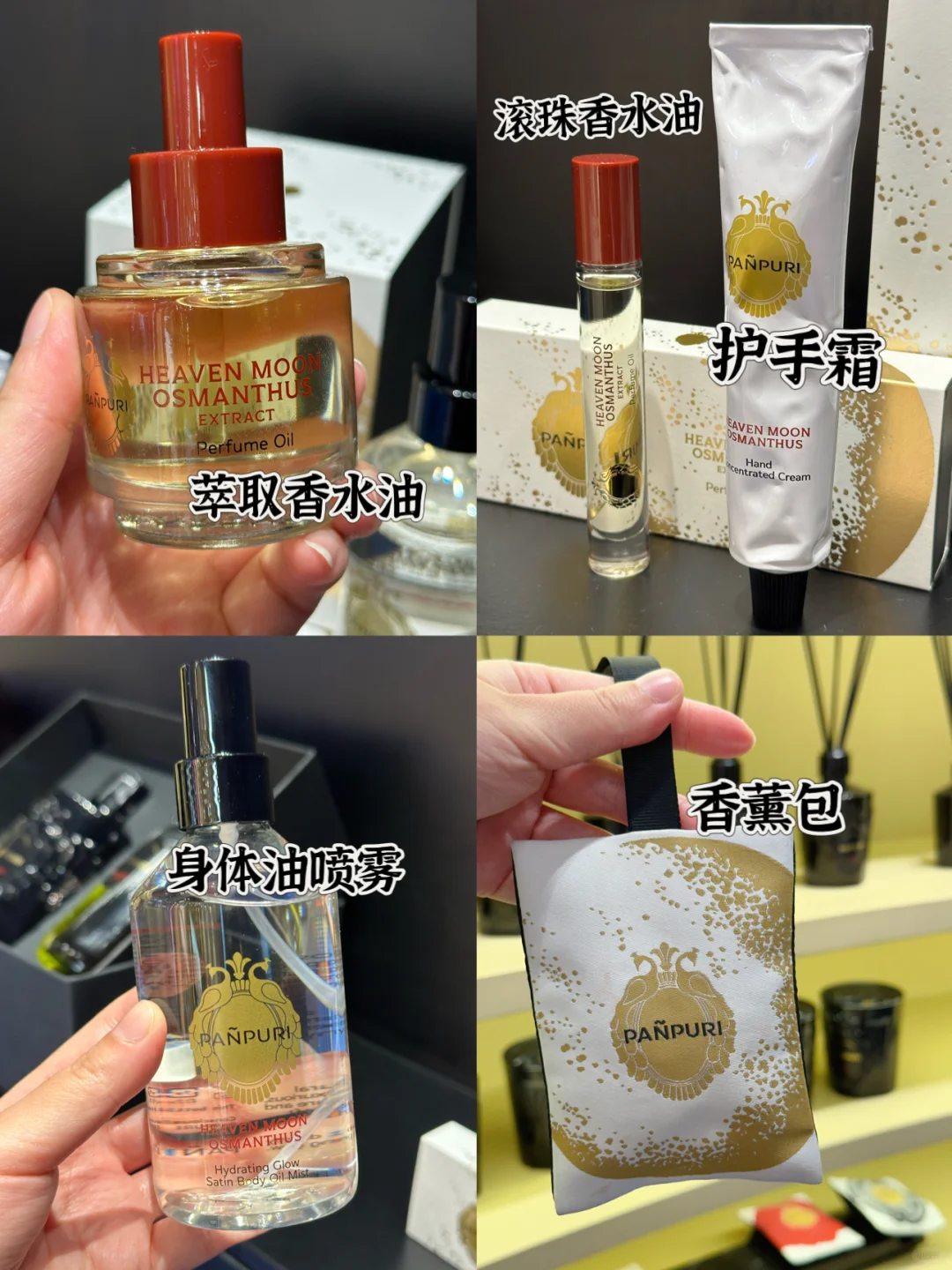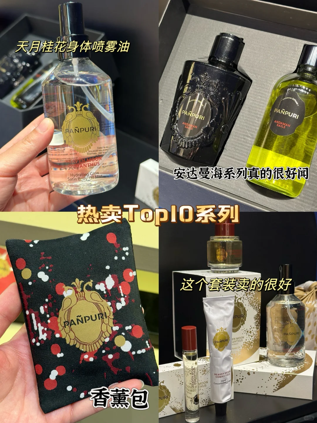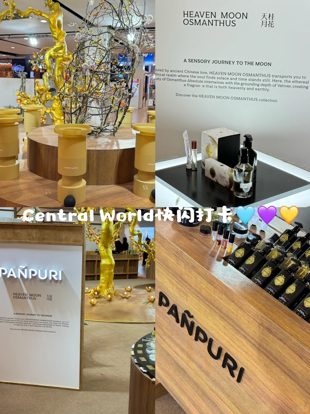 泰国香水千千万 我最爱的只有它👉自从入了PANPURI的坑以后再也不出来🥰每次回国必呵呵家人朋友带的伴手礼就是他了‼️他们家不仅味道好闻高级 还是泰国皇室御用品牌‼️泰国顶级spa品牌以及各大五星级酒店的洗护用品都是他们家的🔆我最喜欢的是他家的香水油、香薰和护手霜💕味道盲选也不会出错👍这次他们家新品【天月桂花】系列上新啦‼️纯天然草本香气没有攻击性🥰淡淡的桂花味真的非常清爽✔️推荐香水和香薰包 是真的好闻☑️它家在Central World和Siam商圈都有门店‼️推荐给来泰国旅游的小伙伴😘简直不要太方便👍