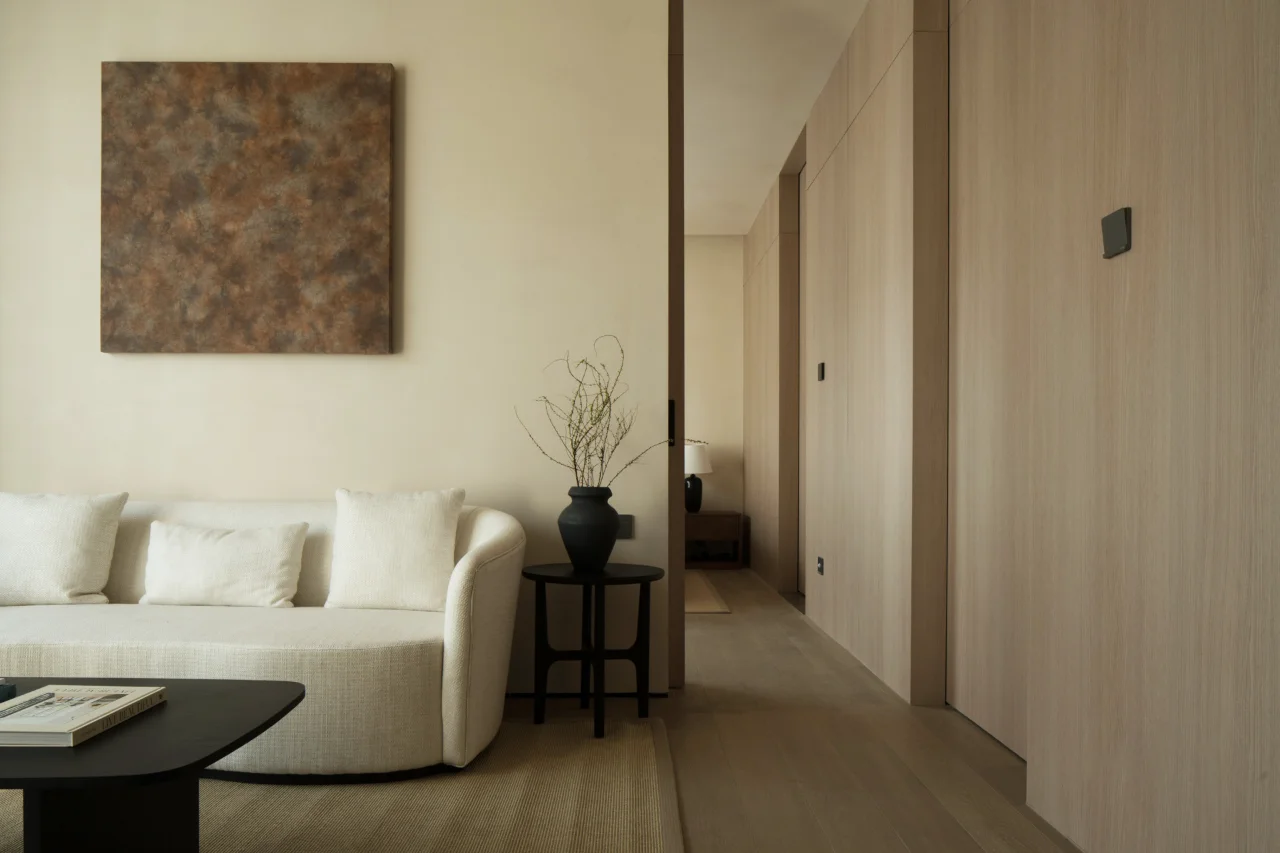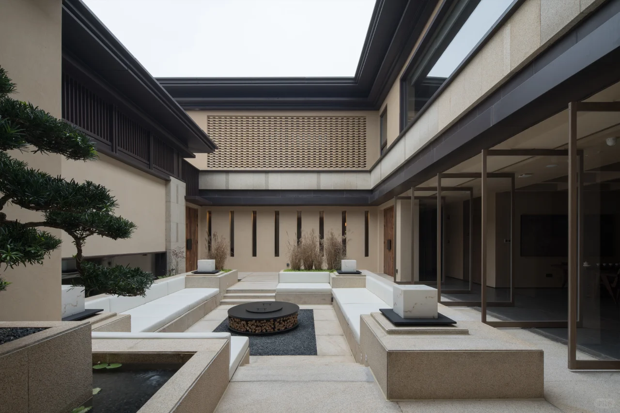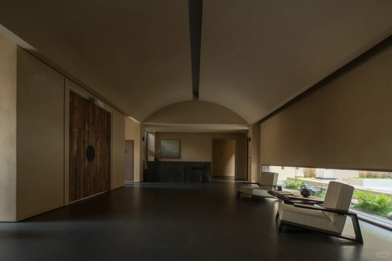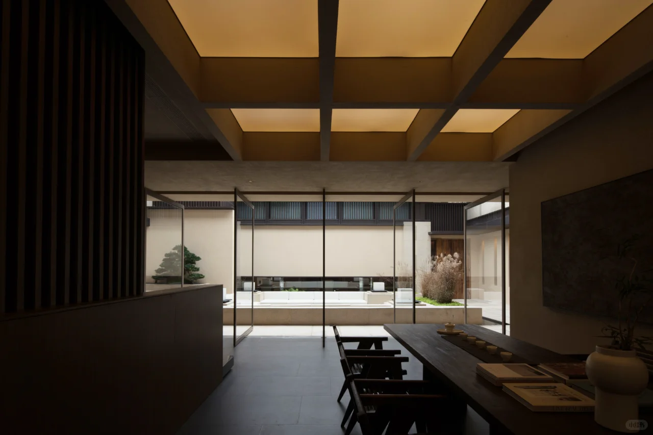 公共空间通过下沉式庭院花园和毗邻的茶室区突出自然宁静的氛围,营造出一种远离城市高压的放松环境。木框玻璃隔断等元素则提供了自由调整的灵活性,连接室内外空间。大小比例各不一的矩形窗户,将自然光引入室内。