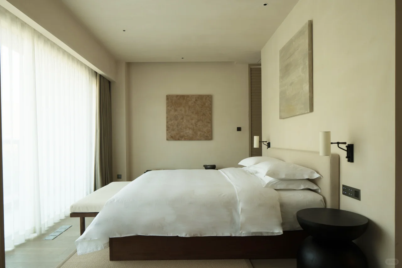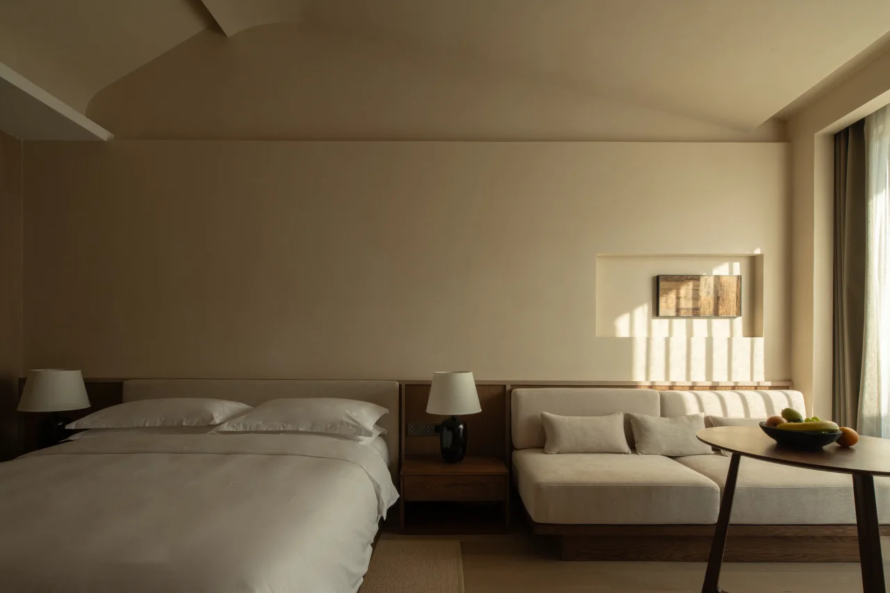 客房采用暖色木质及土色纹理漆,营造出温馨的氛围。倾斜天花板的曲线从大堂一直延伸到特大床套房的内部。每间客房都装饰有精心挑选的长安艺术品,包括染色丝绸画、风景或建筑插图以及手工陶瓷作品,搭配精心挑选的古董家具。