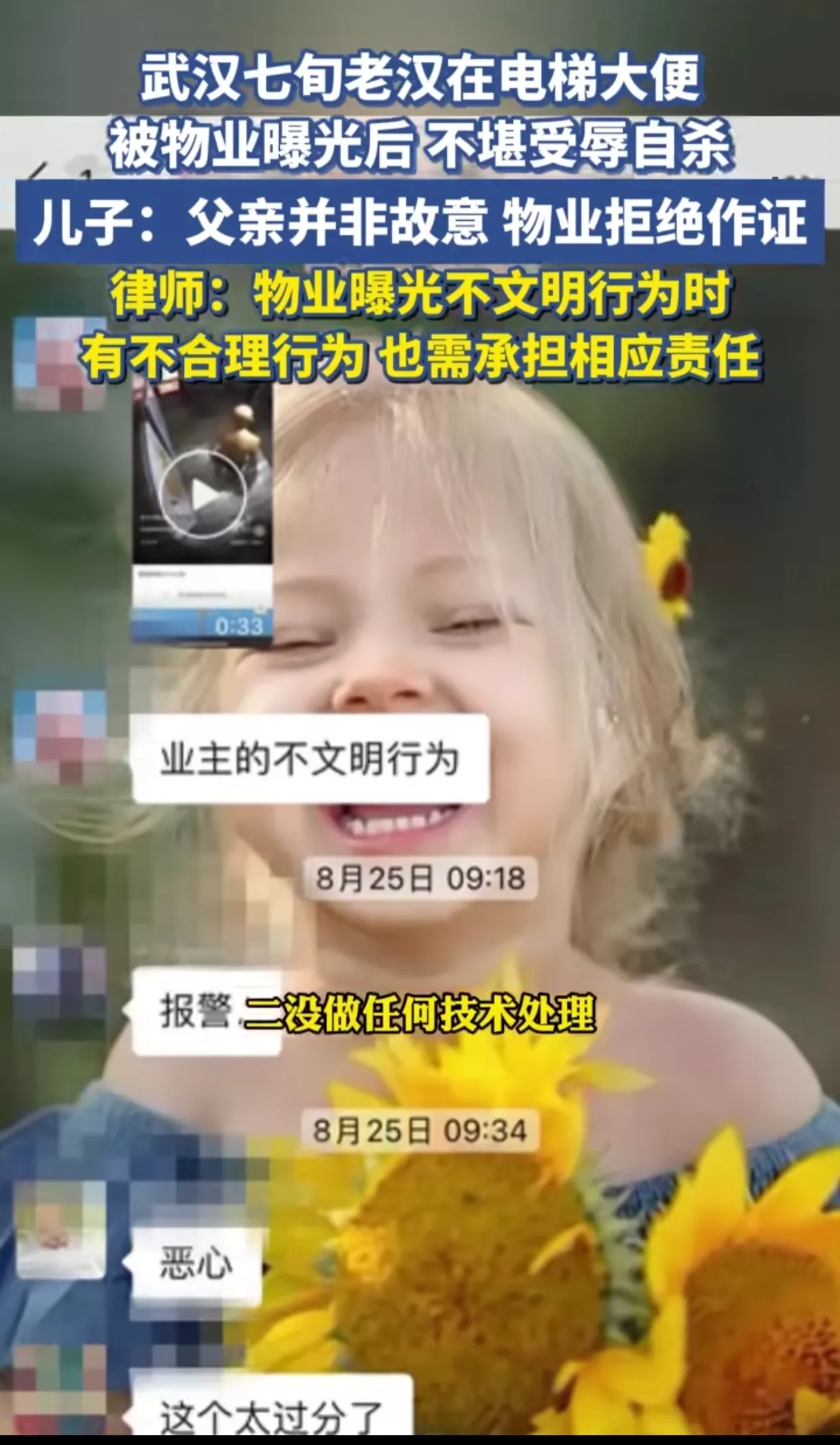 湖北武汉七旬大爷憋不住在电梯大便!被物业曝光后离家跳河自杀!武汉七旬周大爷的儿子爆料,自己父亲,当天出门外出去公园遛弯,到了吃饭时间坐电梯准备回家时,在电梯内突然肚子非常难受,实在无法控制忍受,手里刚好有个塑料袋,就放在地上,在电梯内解决了。