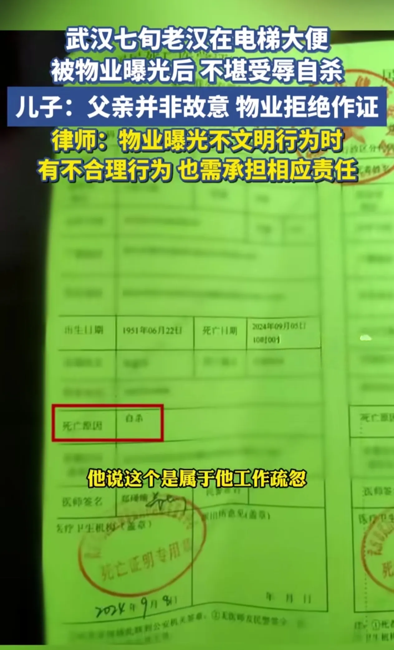 经过警方的调查后,确认大爷是自杀,排除了刑事案件可能性,周大爷儿子气不过找物业理论,要求物业出个证明书,证明父亲在电梯不是有意的,而是确实人有三急,物业经理承认工作有疏忽,但是证明书不可能给开,律师表示为了公共利益,实施监督行为不违法,如果没有打码就把当事人发到群里,确实存在不合理的行为,因此物业需要承担一定的责任。