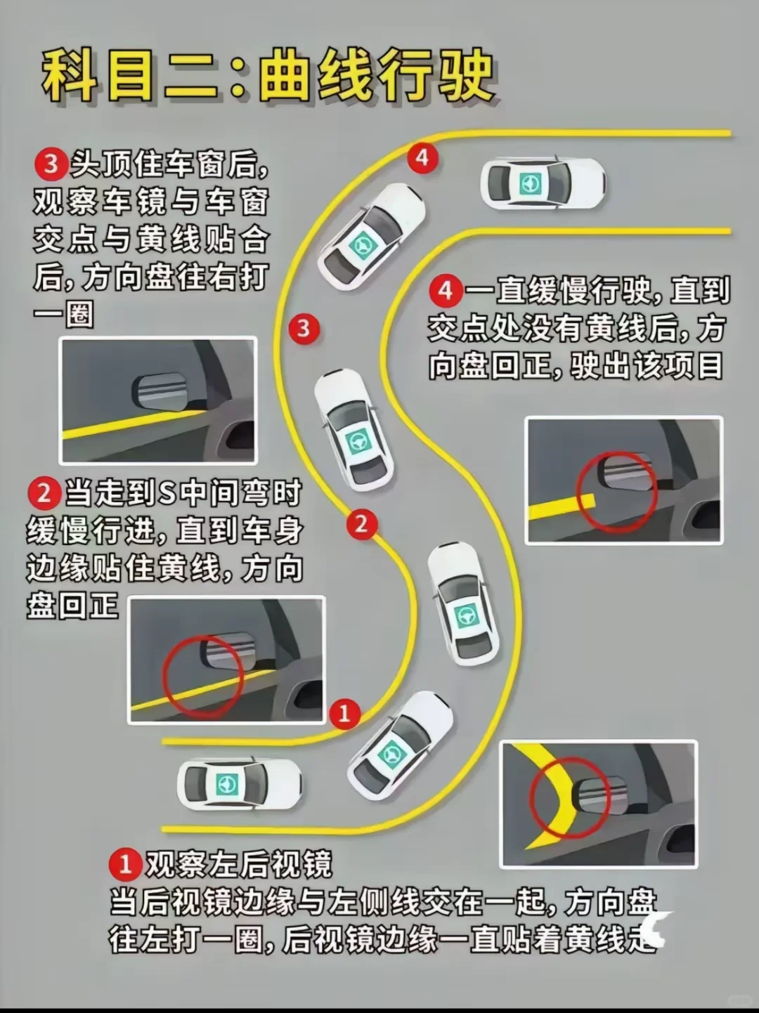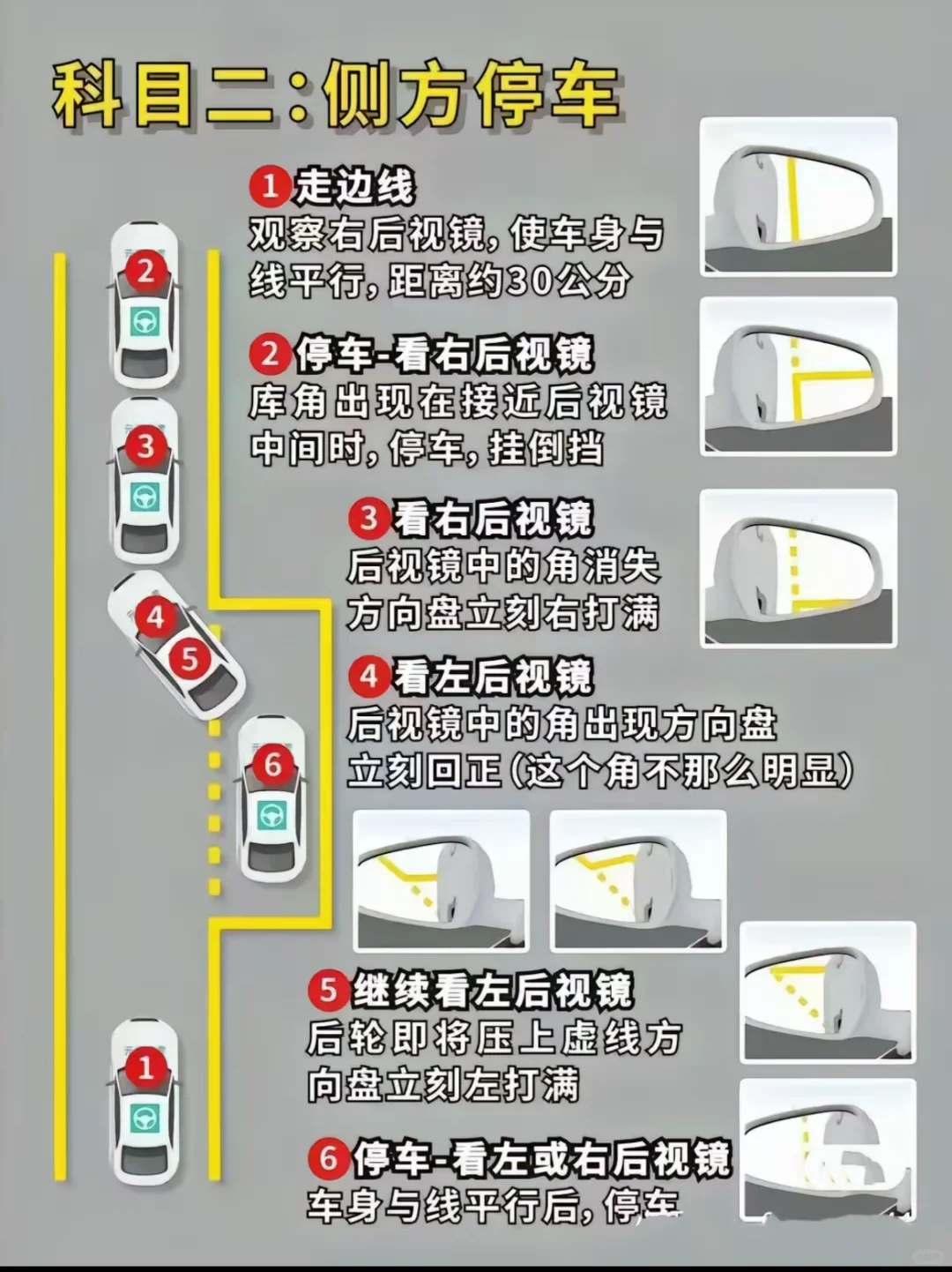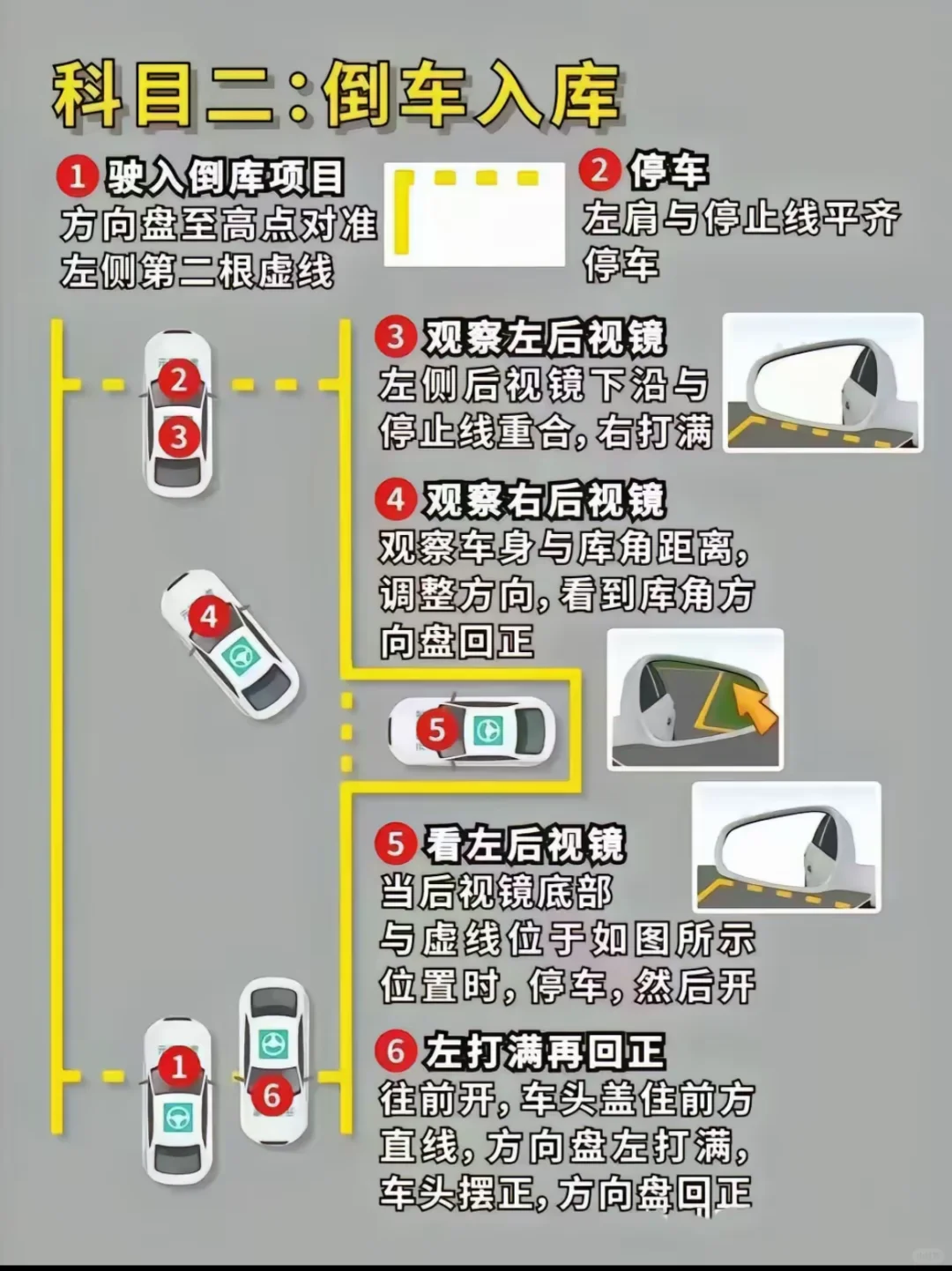 科目二:倒车入库 ① 驶入倒库项目 方向盘至高点对准左侧第二根虚线 2 3 ②停车 左肩与停止线平齐 停车 3 观察左后视镜 左侧后视镜下沿与停止线重合,右打满 4 观察右后视镜 观察车身与库角距离,调整方向,看到库角方 向盘回正 6 ⑤看左后视镜当后视镜底部 与虚线位于如图所示 位置时,停车,然后开 ⑥ 左打满再回正 往前开,车头盖住前方 直线,方向盘左打满,车头摆正,方向盘回正