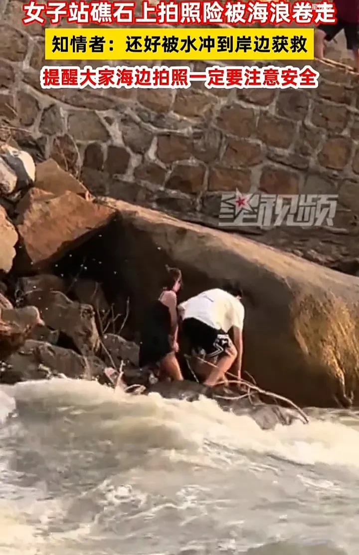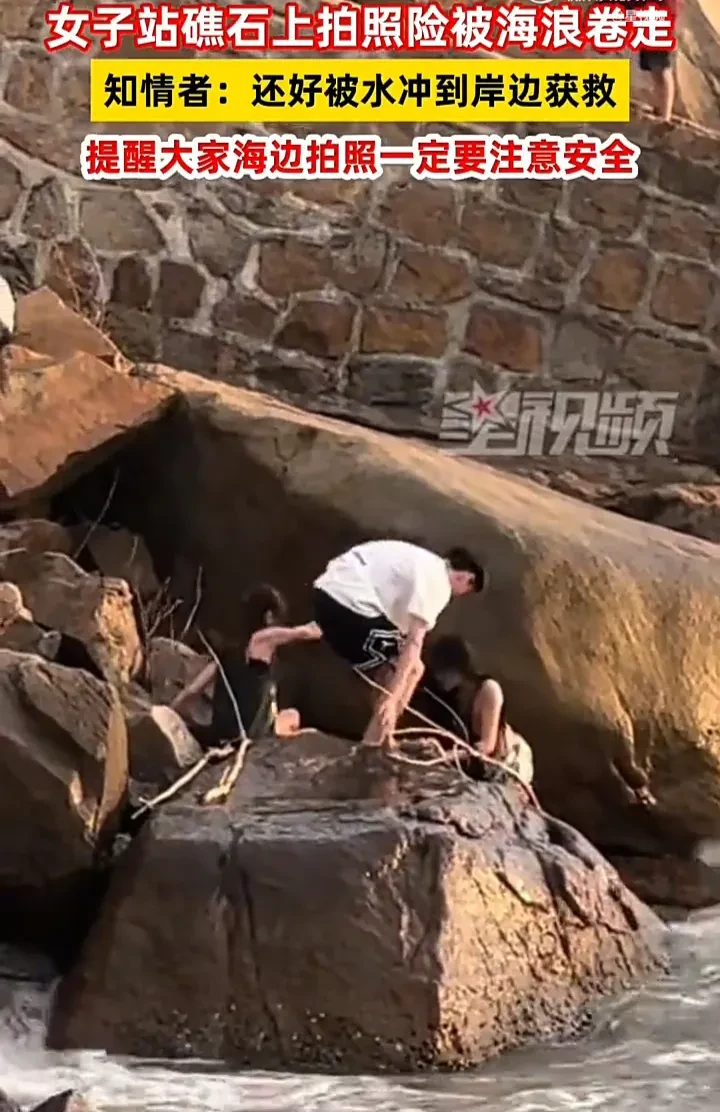 近日,广东一位网友发视频称,一名女子去海边游玩,站在礁石上拍照时,因脚滑不慎落水,险些被海浪卷走。所幸被周边群众看见,及时上前帮忙,这才将女子救了上来。