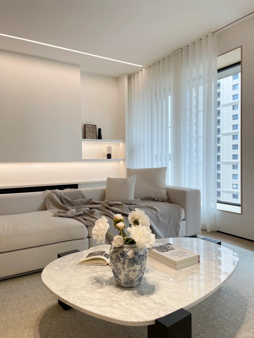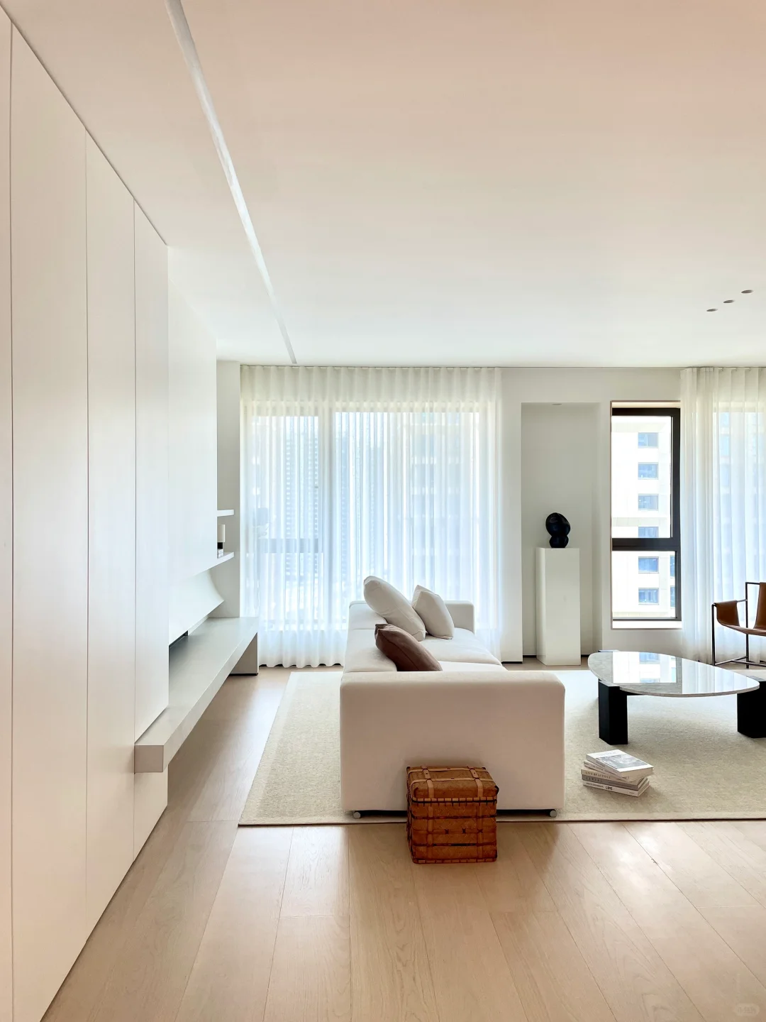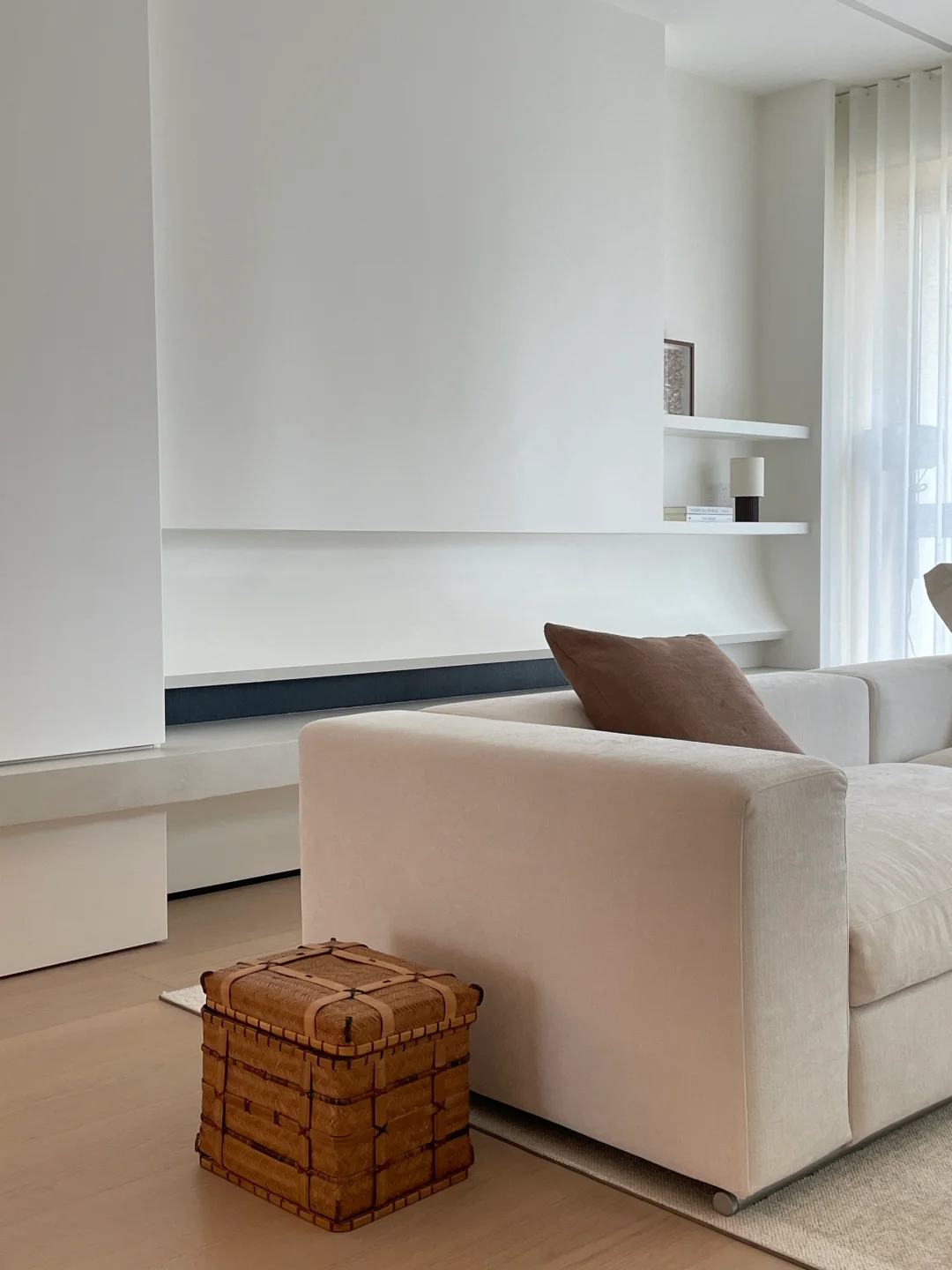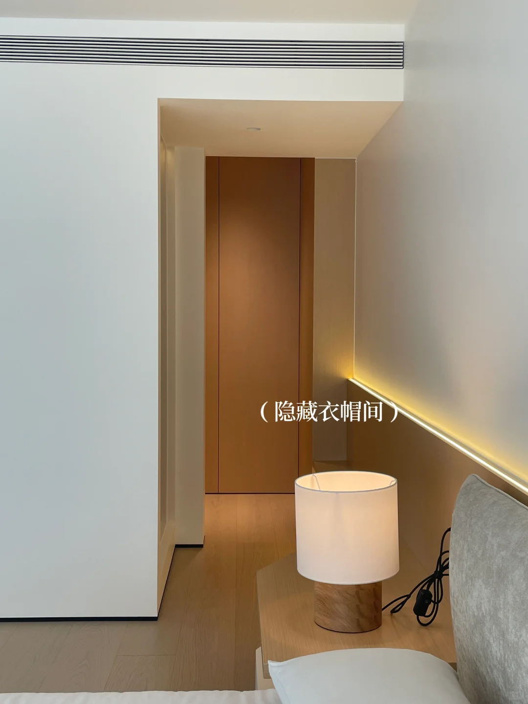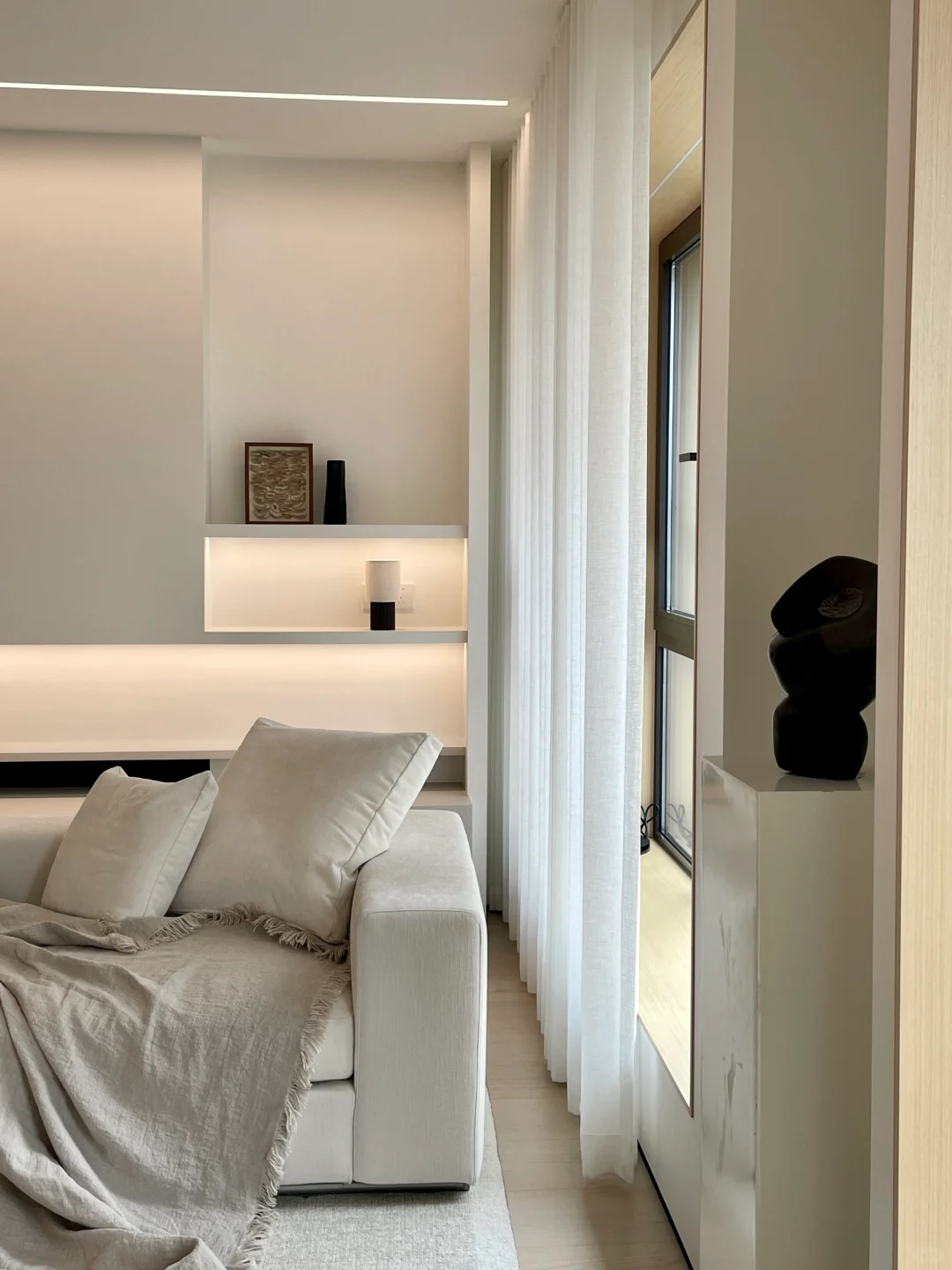 ADDRESS.温州新希望天麓 入住奶油系的家,享受到硬装的秩序度带来的满满安全感… 在客厅柔软沙发后保留过道,墙面用硬装做内嵌柜体样式,收纳+美观两者结合,内嵌灯带用暖色灯光营造温馨氛围,一整条的收纳空间……比硬凿墙留空间更适合的宝宝秘密基地/爱宠睡眠空间。 不浪费每一寸面积、珍惜每一个过道变废为宝的机会。不讲细节,但已被满满细节包裹了。