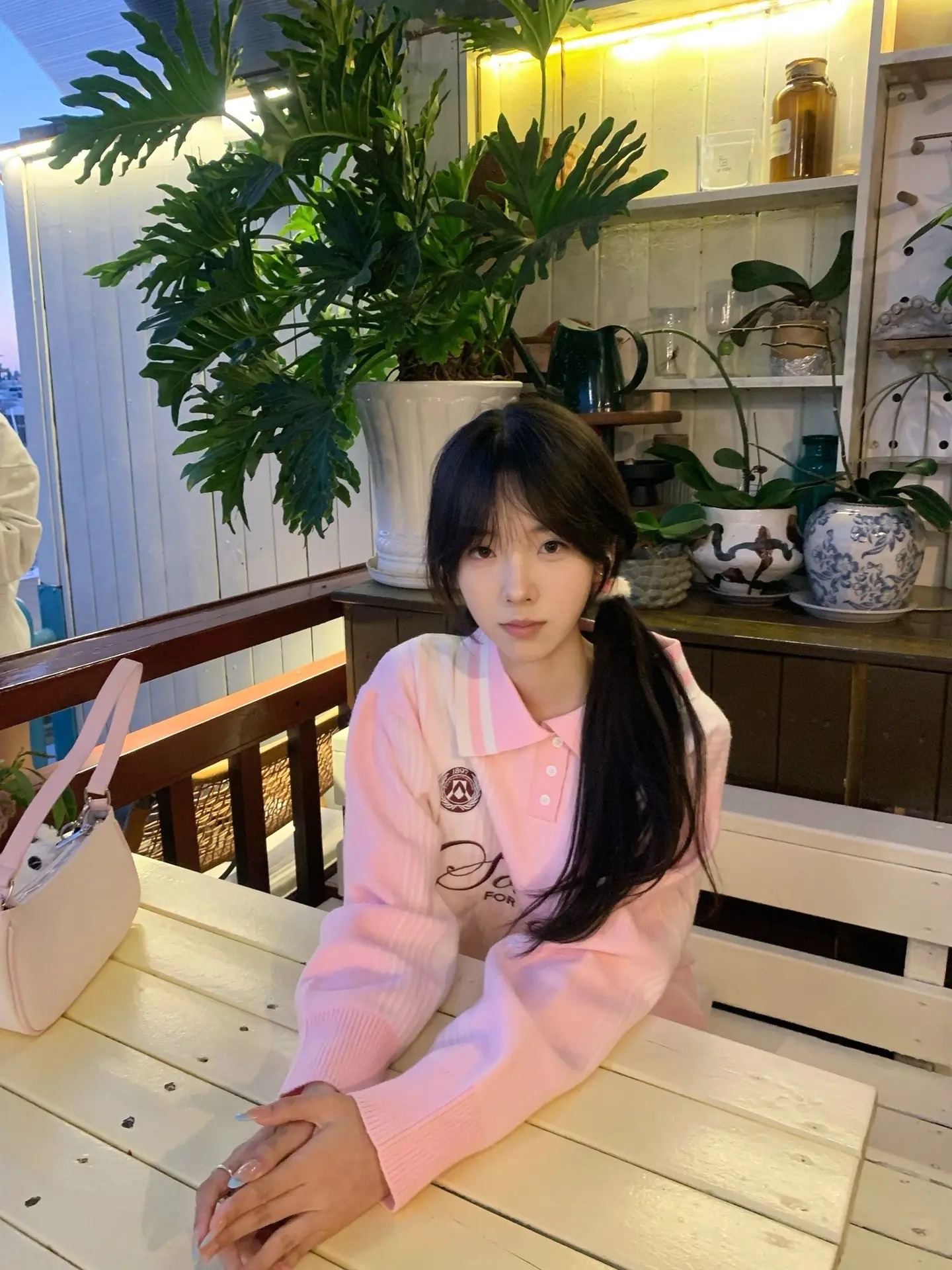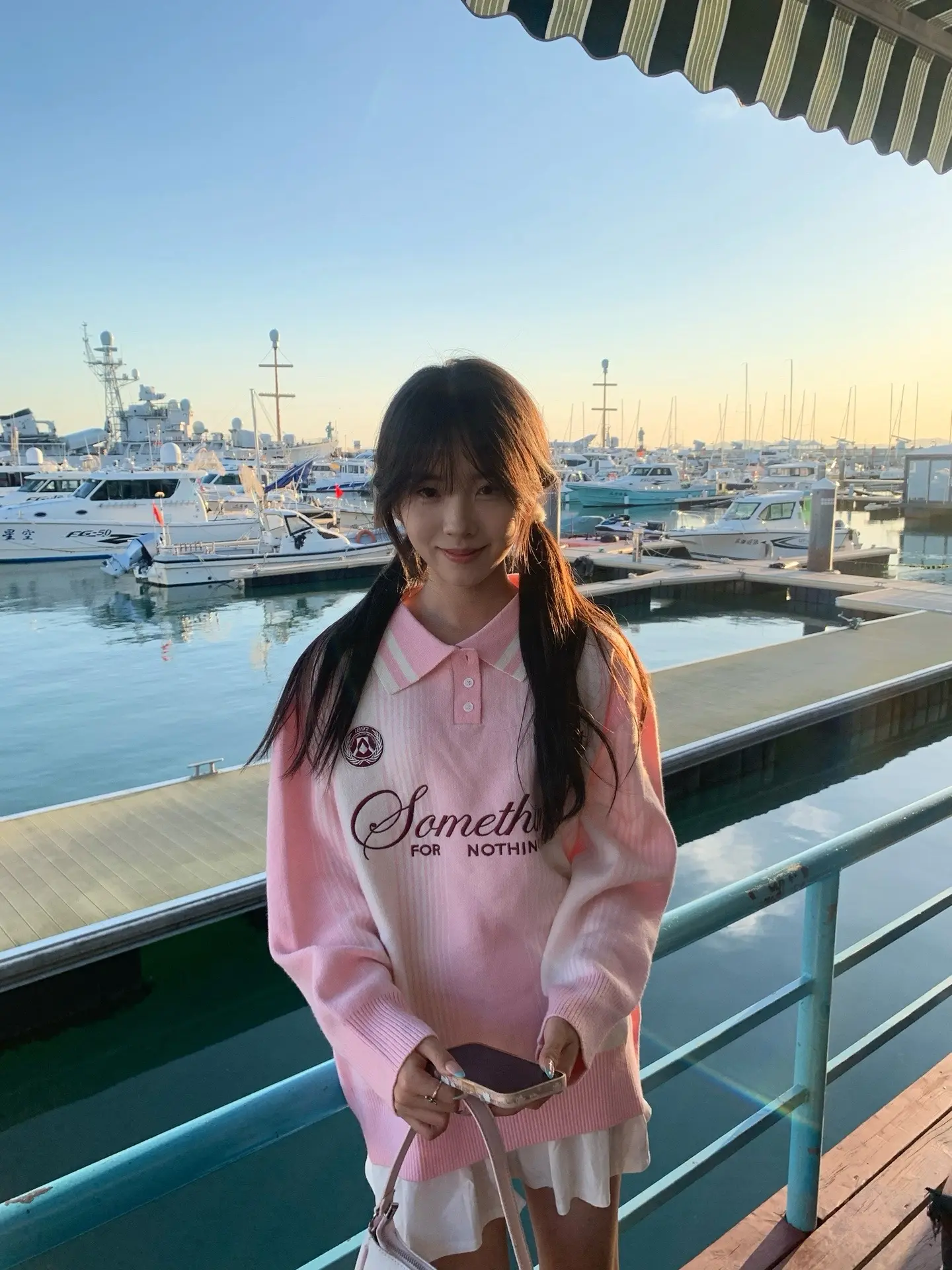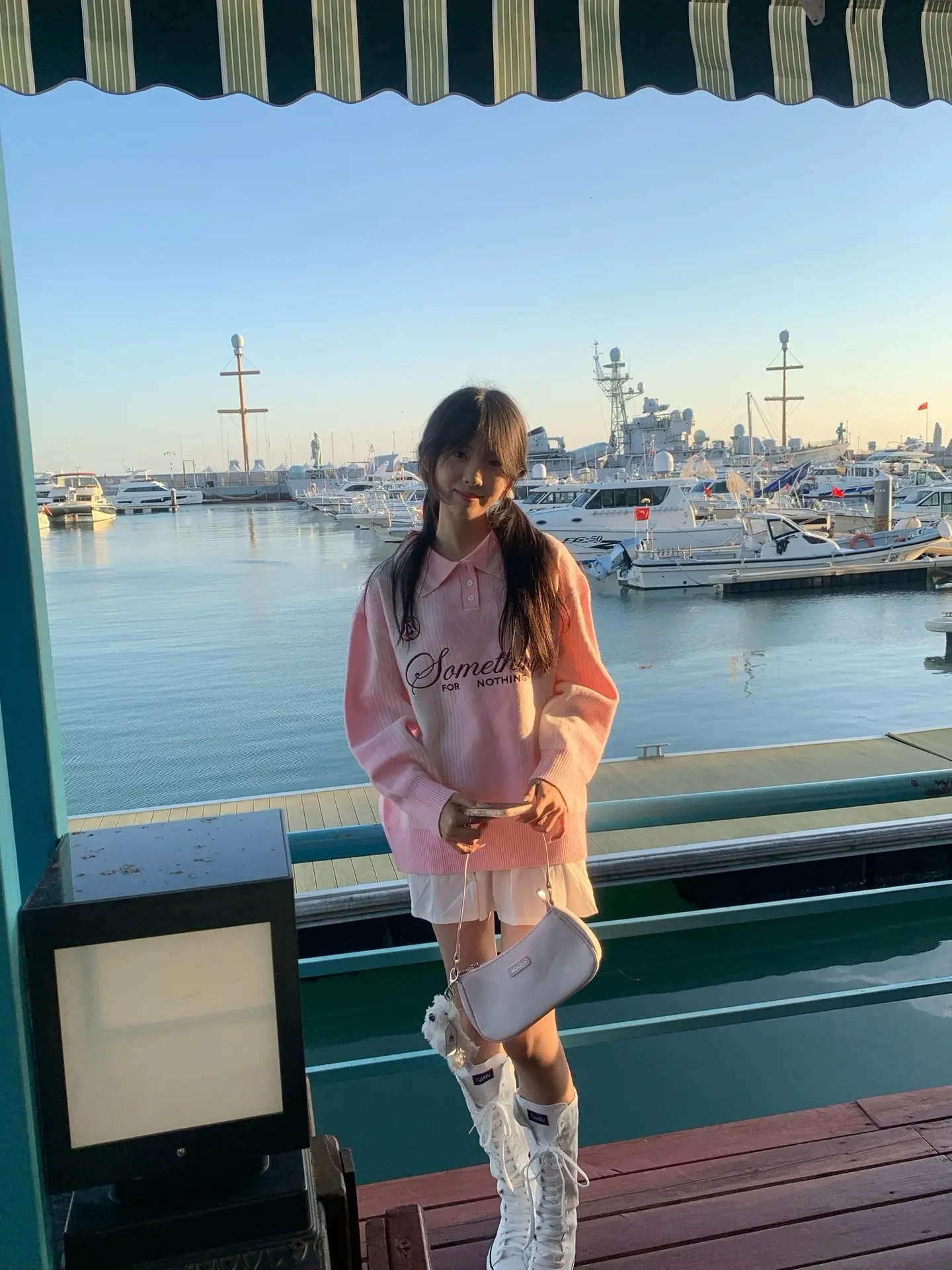 一位长相漂亮、身材出众的姑娘,穿上了一件对身材要求极高的紧身款一字肩粉色针织衫搭