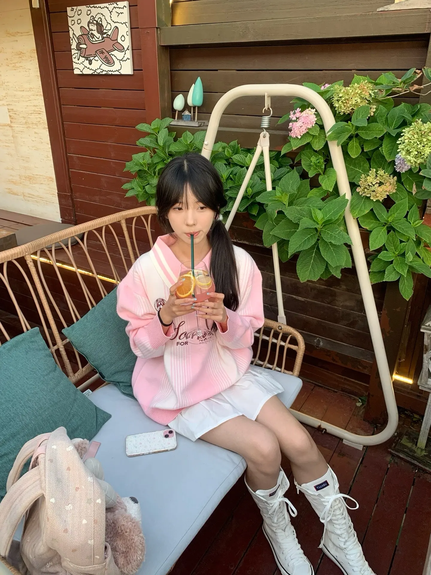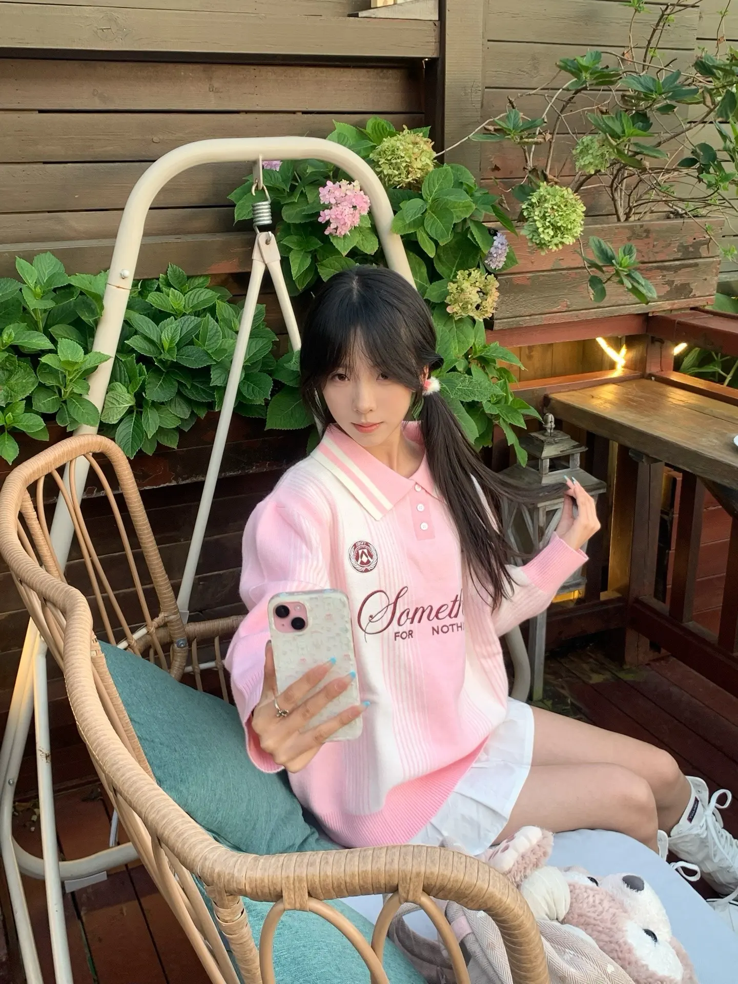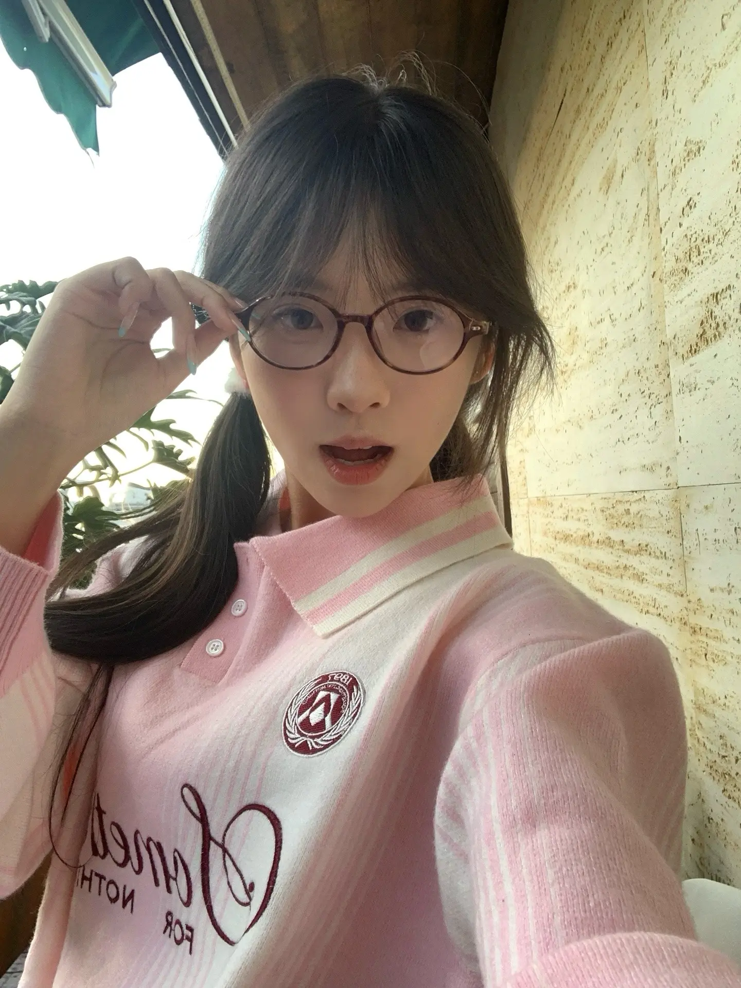 一位长相漂亮、身材出众的姑娘,穿上了一件对身材要求极高的紧身款一字肩粉色针织衫搭