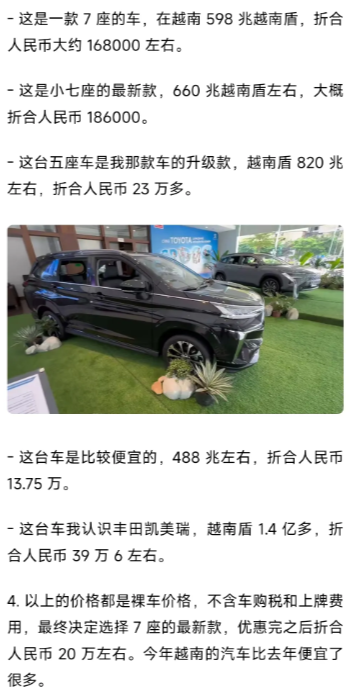 越南自己不能生产的工业产品都非常昂贵。汽车普遍比中国贵上一倍左右,网友在越南看的凯美瑞价格,约人民币39.6万,差不多和我们九十年代时的价格持平。家用电器也是一样,买日本货没有一种是便宜的。 日本就是企业就是欺负越南自己没有能力生产。