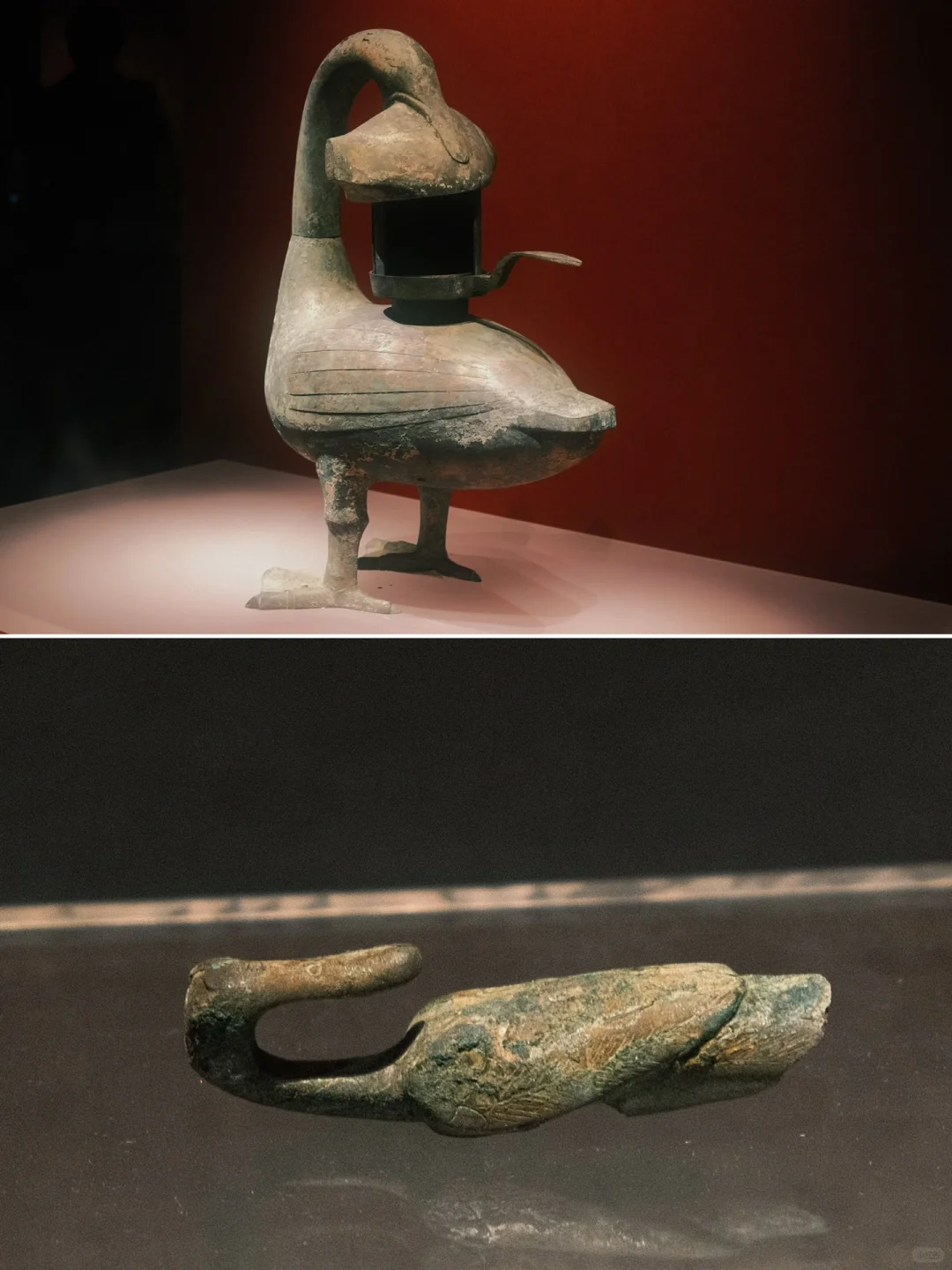 ❾雁鱼形铜灯:鸿雁回首衔鱼伫立状的环保灯