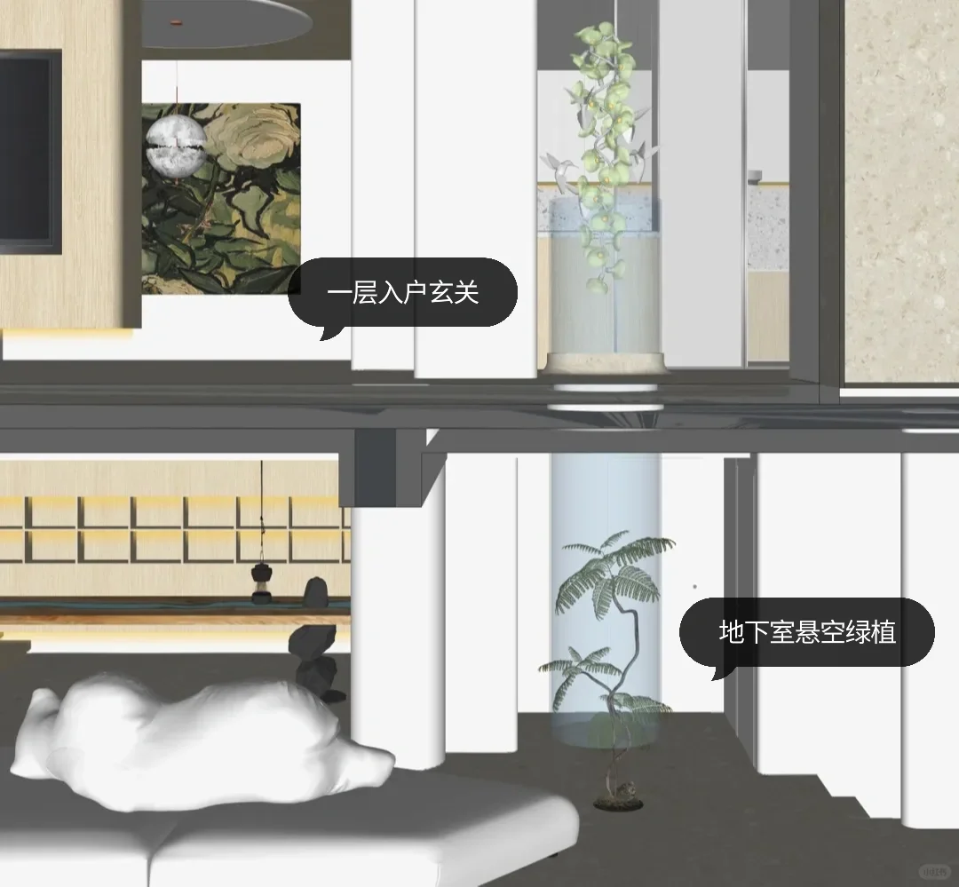 NEWCASE.温州悦府排屋别墅 你家的别墅做的像平层、毫无存在感,怎么办?跟着我们一起在玄关“开个洞”吧! 本案中,我们在别墅一层入户玄关处开了个链接上下层的洞,一层内做艺术吊灯,充当回家迎宾灯;地下室与一层相连,中间用玻璃隔断,直接做悬空绿植造景,上下层联通家中更有空间感。地下室绿植造景也能充当空间中心点,摆上沙发充当客厅背景。一招拯救别墅的不联通,你值得拥有[赞R]